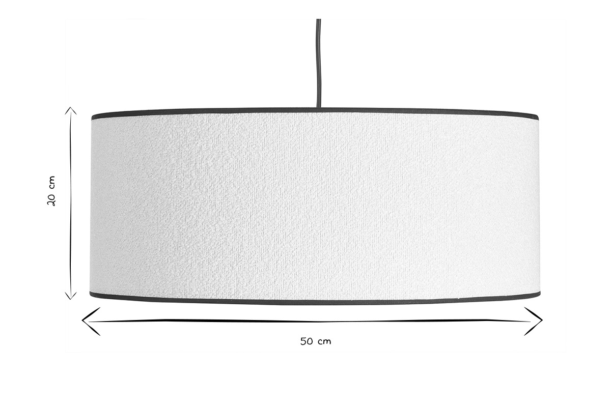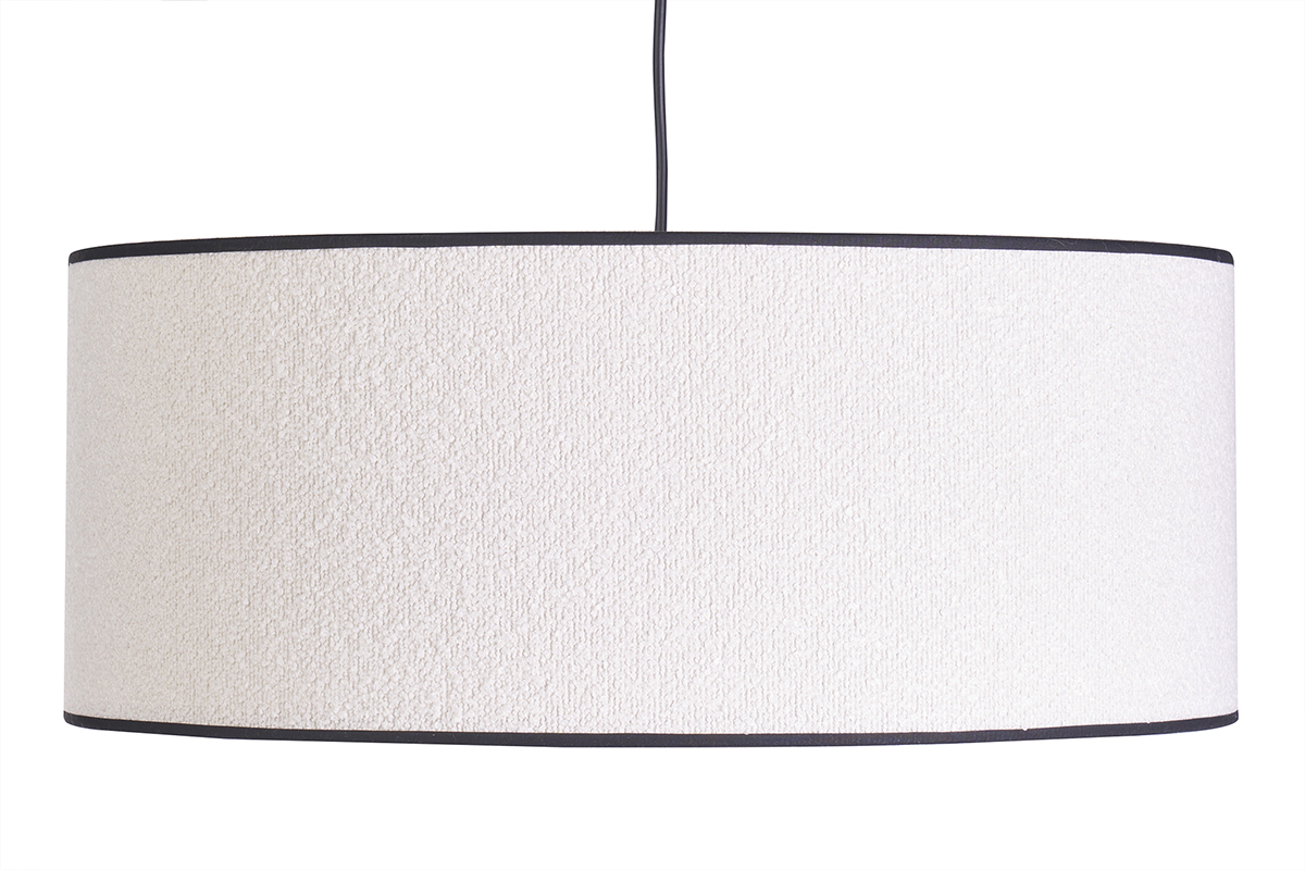 Fabriquée en France, cette grande suspension aux dimensions L50 x L50 x H20 cm et aux lignes épurées, présente une superbe association de matières. Le grand abat-jour cylindrique est habillé d'un tissu effet laine bouclée blanc très lumineux. Sa silhouette minimaliste est délicatement soulignée par le biais de couleur noire.