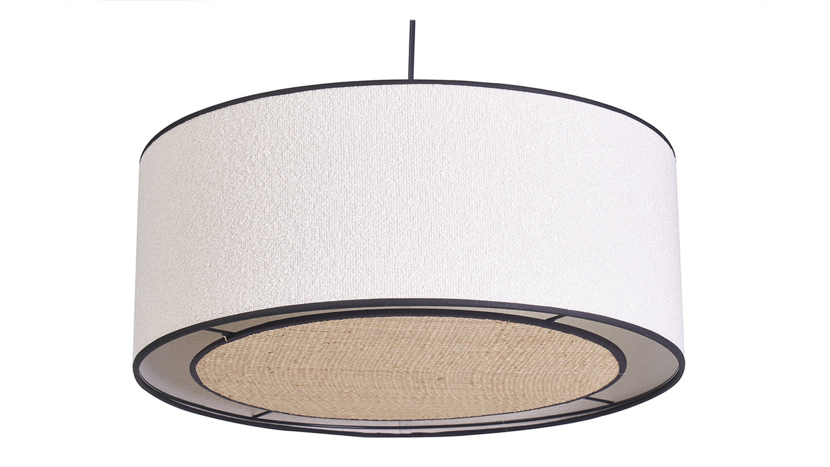 Matière : abat-jour en lin et rabane ; structure en métal noir ; câble et rosace en plastique