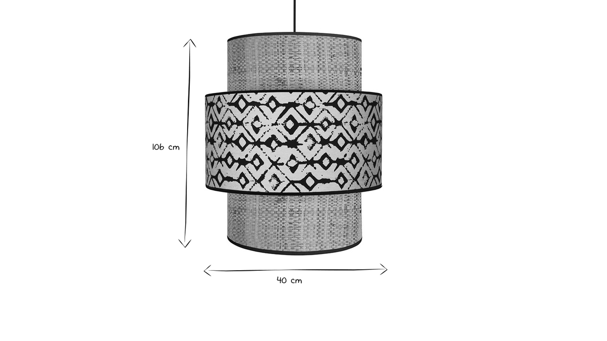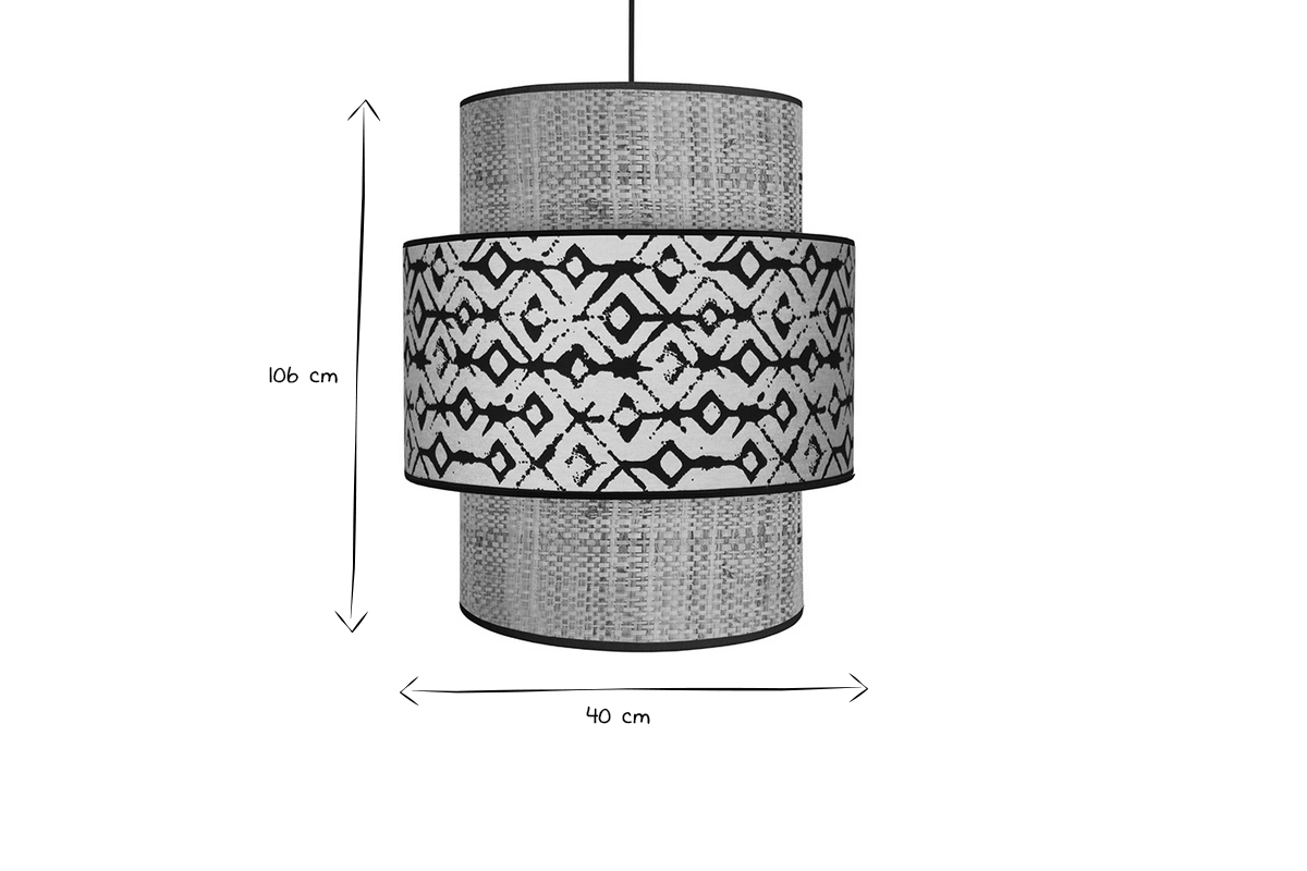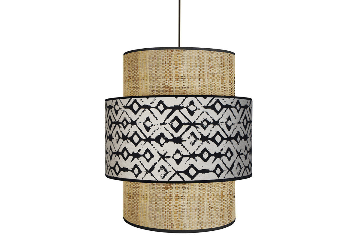 Cette suspension design en coton et jute est formée par deux cylindres imbriqués dessinant une jolie silhouette tout en relief. ZAZA joue avec les matières pour un rendu atypique. Le mélange avec une base en jute et un cylindre en coton habillé d'un imprimé noir et beige donne à l'ensemble un style ethnique chic et original. Avec son look naturel et chaleureux, la suspension ZAZA est un objet déco qui ne manque pas de caractère.
