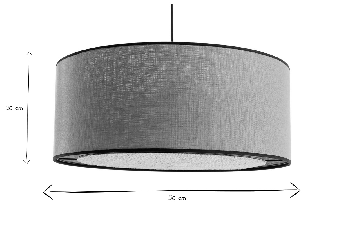 Matière : abat-jour en lin et rabane ; structure en métal noir ; câble et rosace en plastique