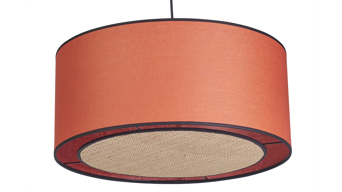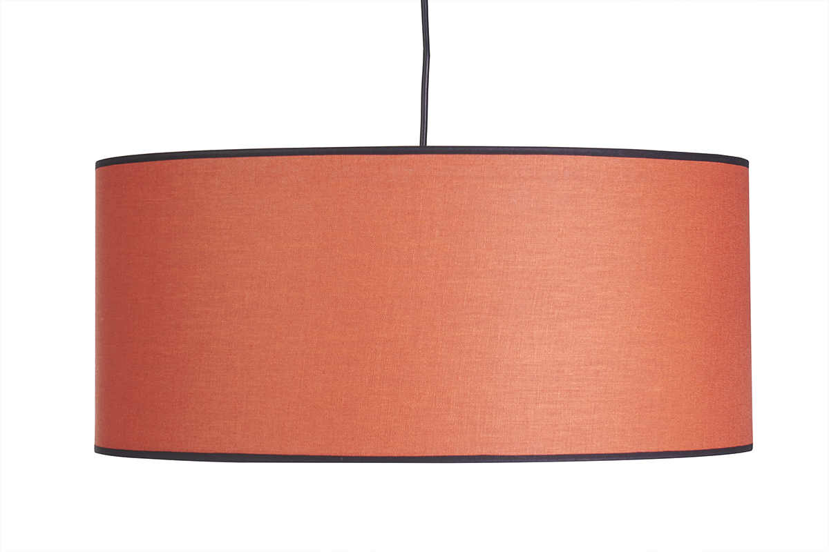 Fabriquée en France, cette grande suspension aux dimensions L50 x L50 x H20 cm et aux lignes épurées, présente une superbe association de matières naturelles. Le grand abat-jour cylindrique est habillé d'un tissu en lin brique. Sa silhouette minimaliste est délicatement soulignée par le biais de couleur noire.