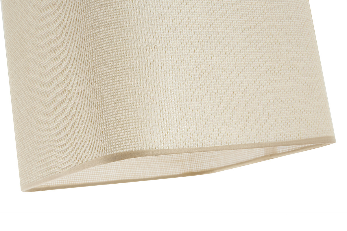 Matières : abat-jour en papier tissé, armature en métal et rosace en plastique