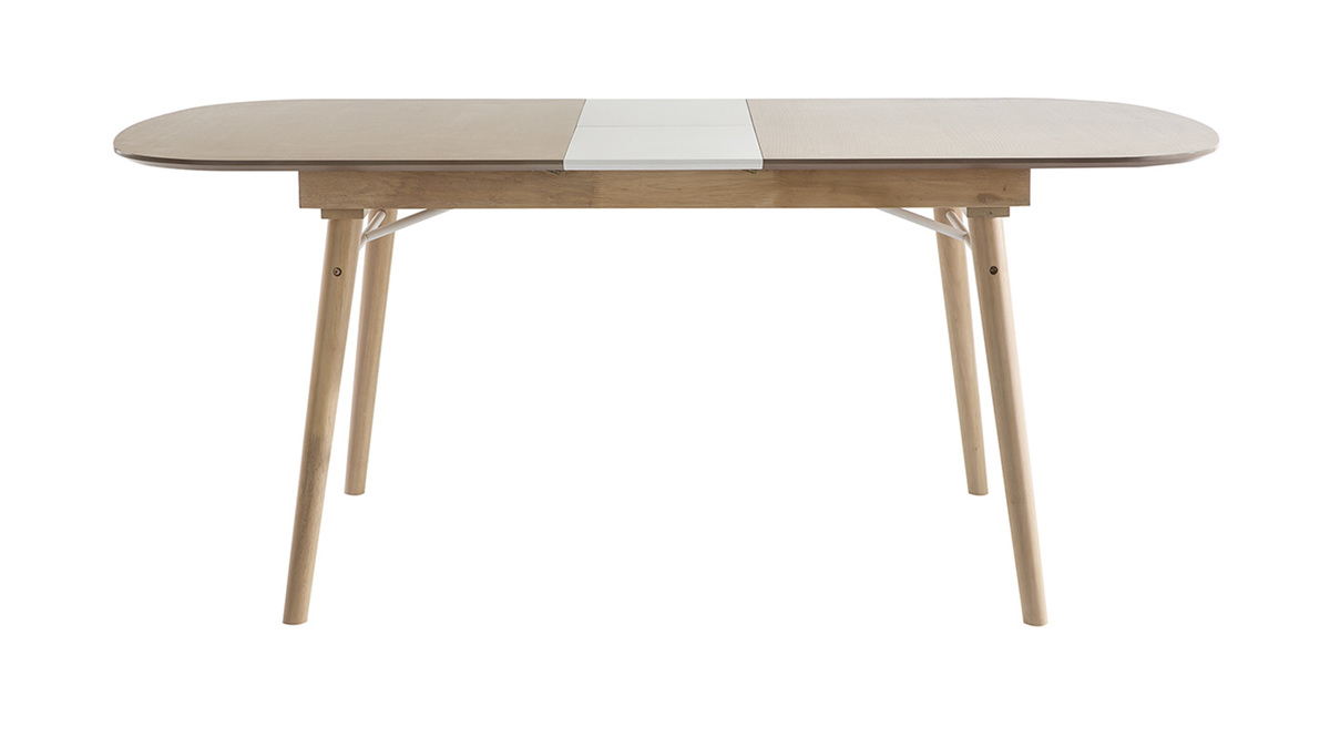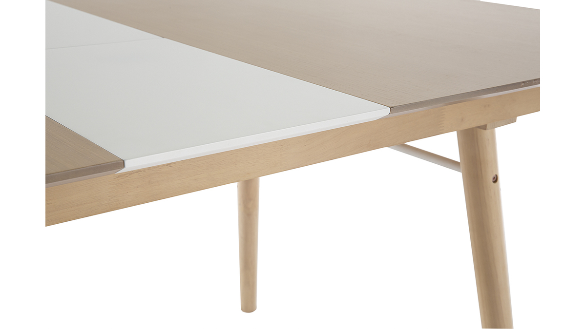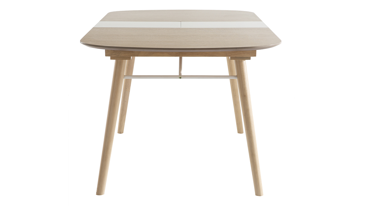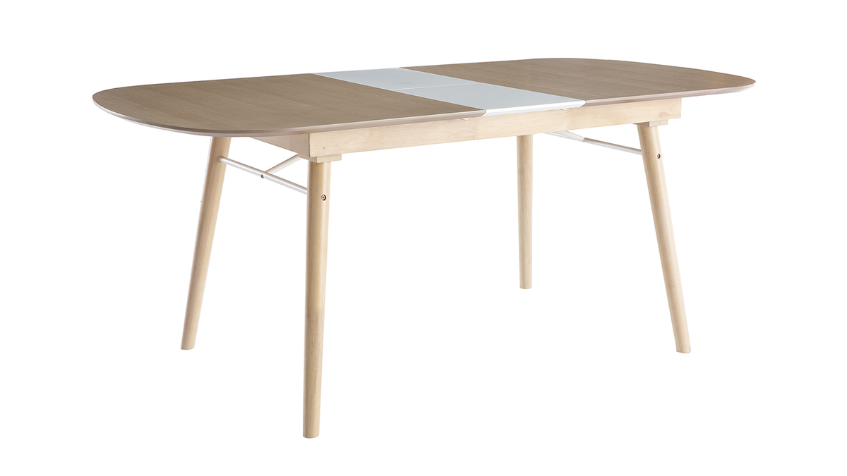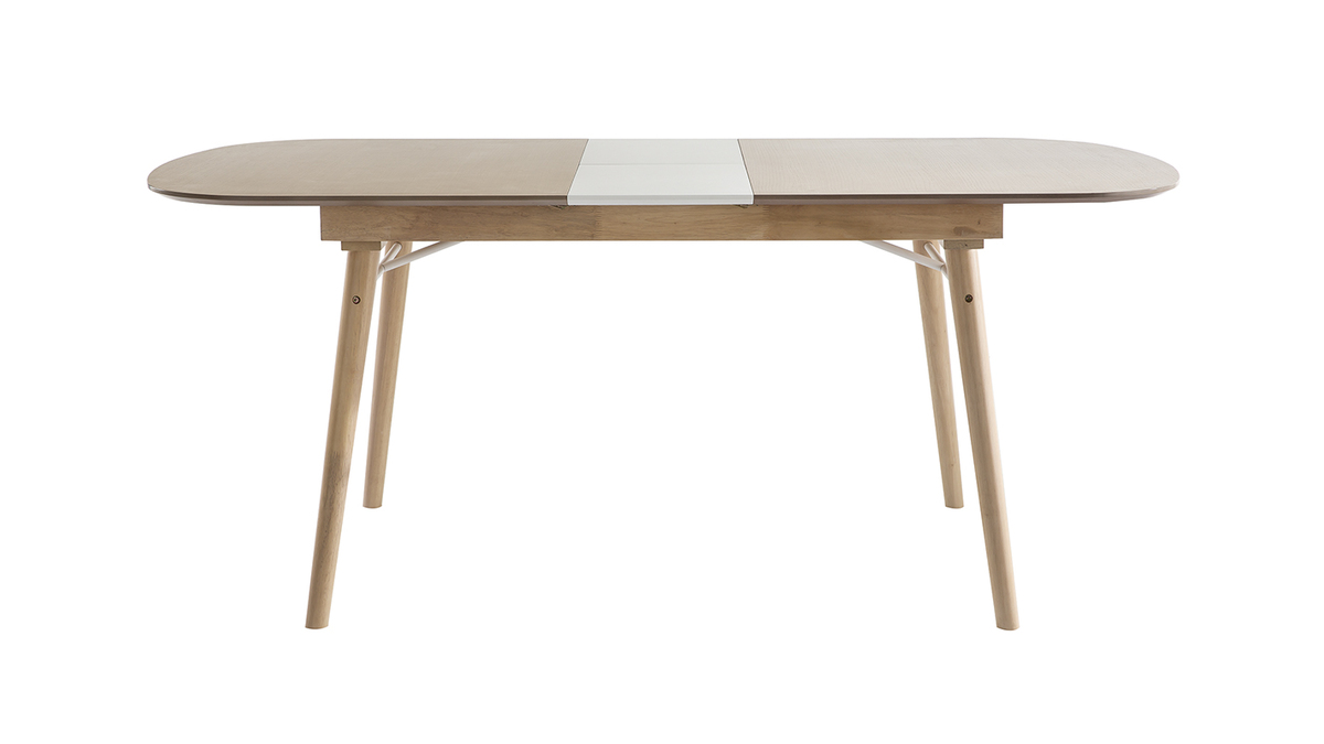 La table extensible Sheldon se compose d'un piètement en hévéa massif et d'un plateau en panneaux de fibres de bois finition chêne clair (épaisseur 1,8 cm) qui contraste à merveille avec la rallonge au fini blanc mat. Un renfort fin et discret en métal blanc vient compléter l'ensemble.