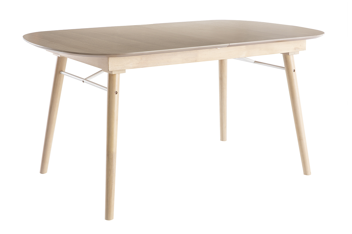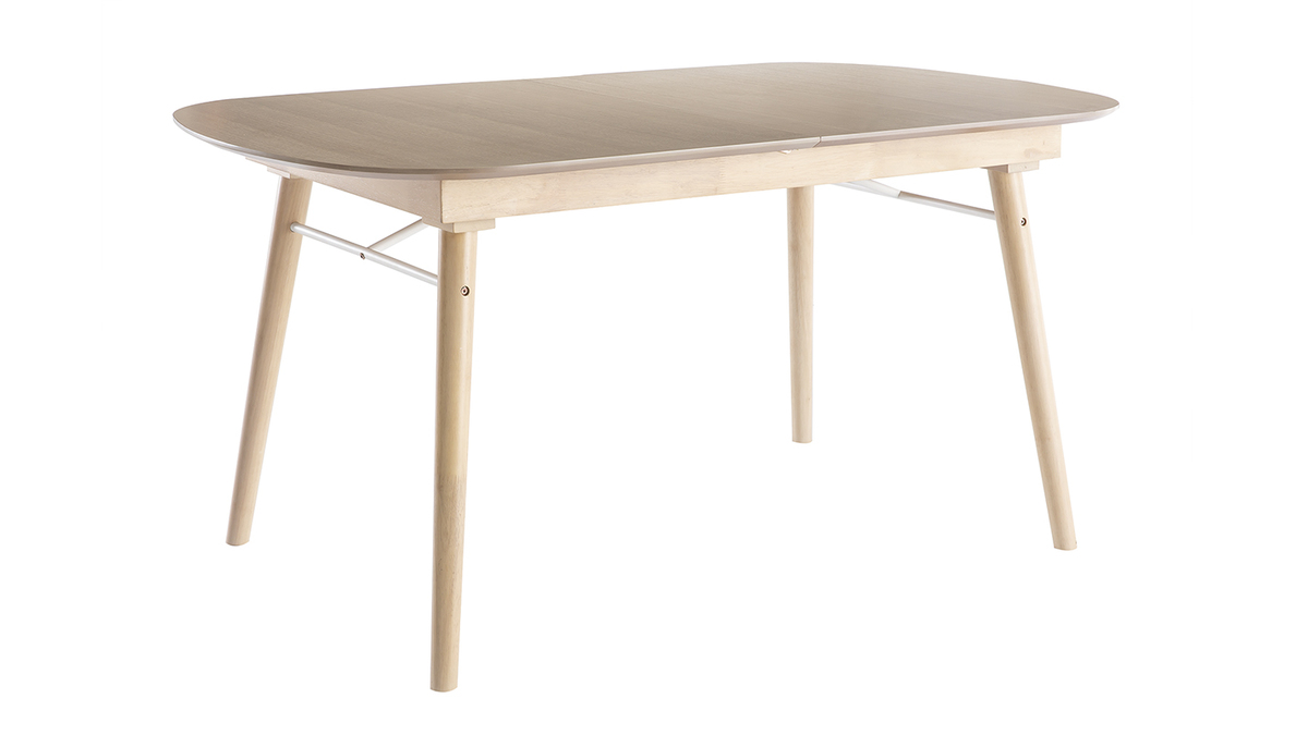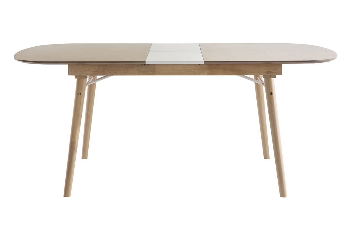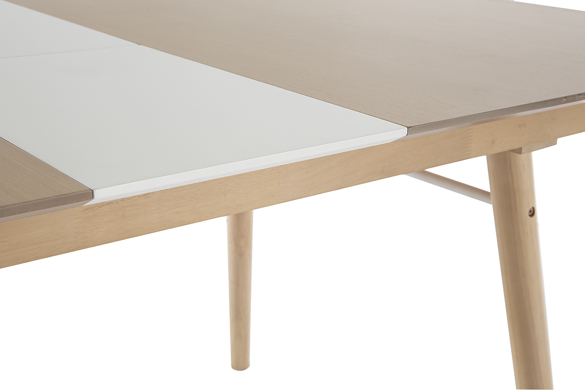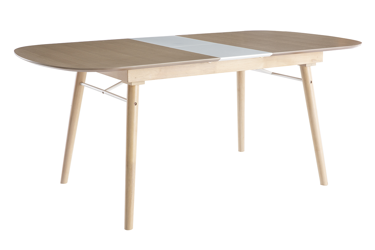La table extensible Sheldon se compose d'un piètement en hévéa massif et d'un plateau en panneaux de fibres de bois finition chêne clair (épaisseur 1,8 cm) qui contraste à merveille avec la rallonge au fini blanc mat. Un renfort fin et discret en métal blanc vient compléter l'ensemble.