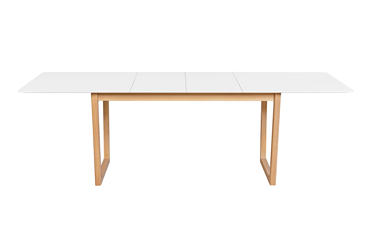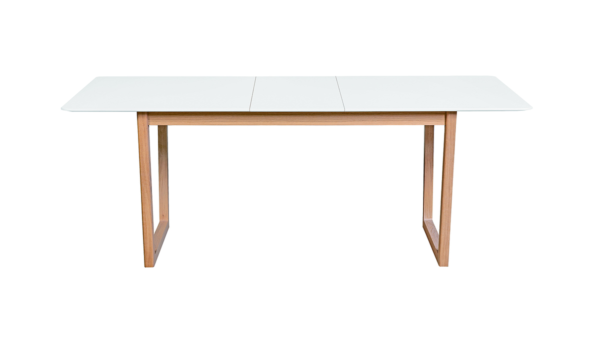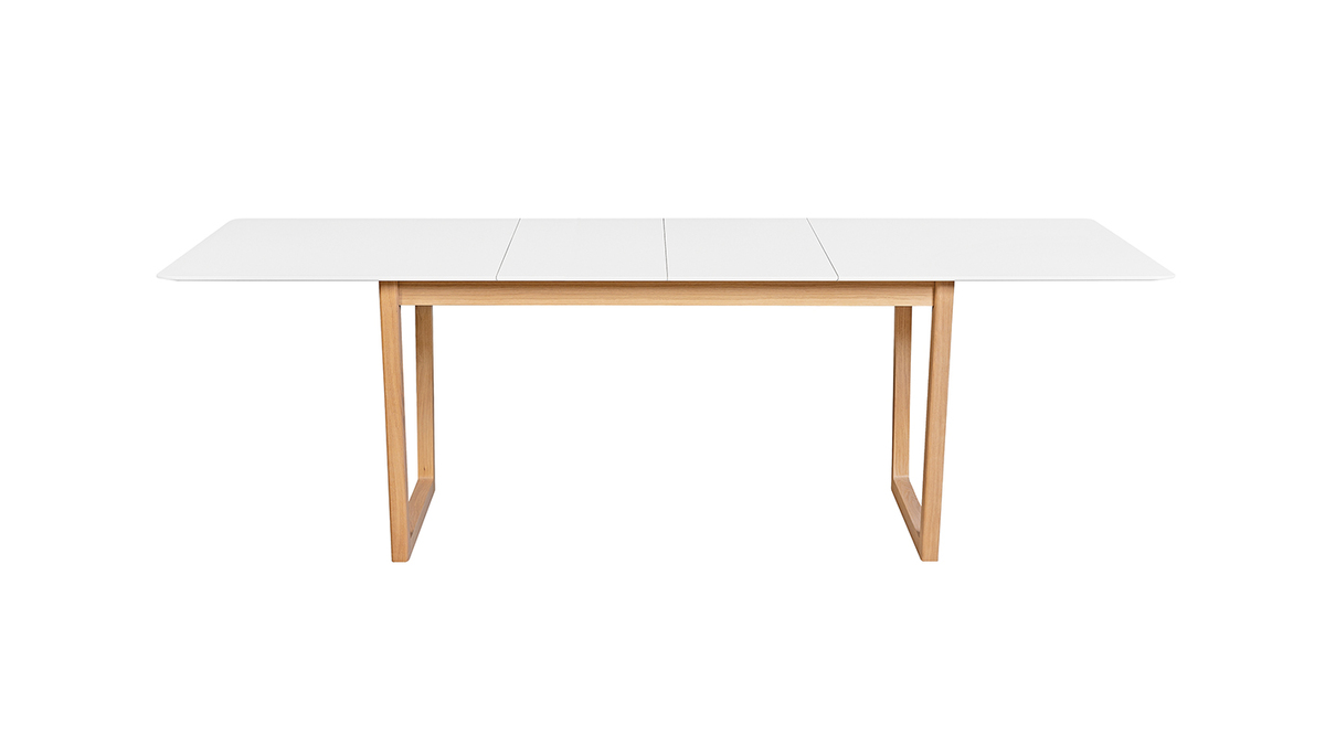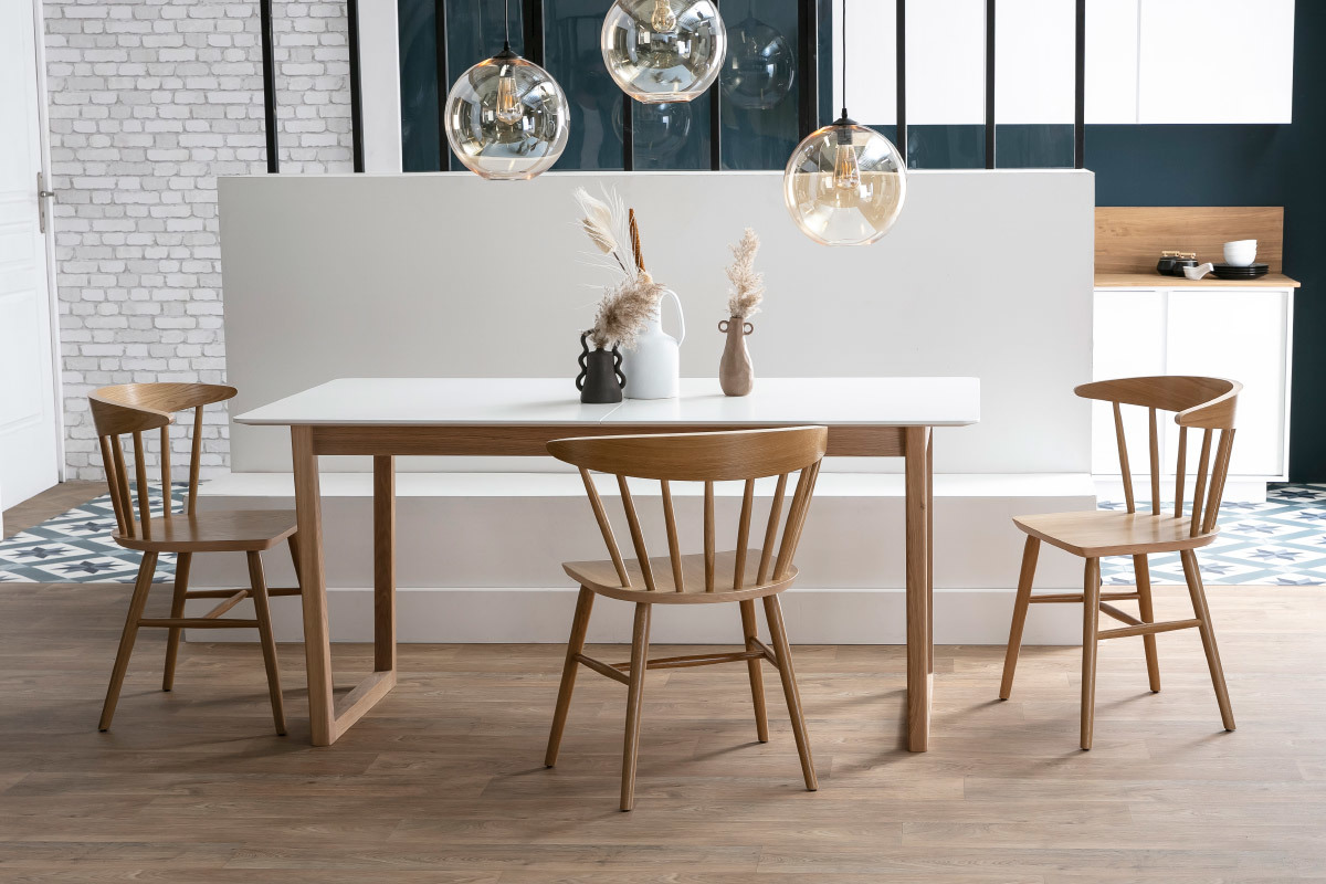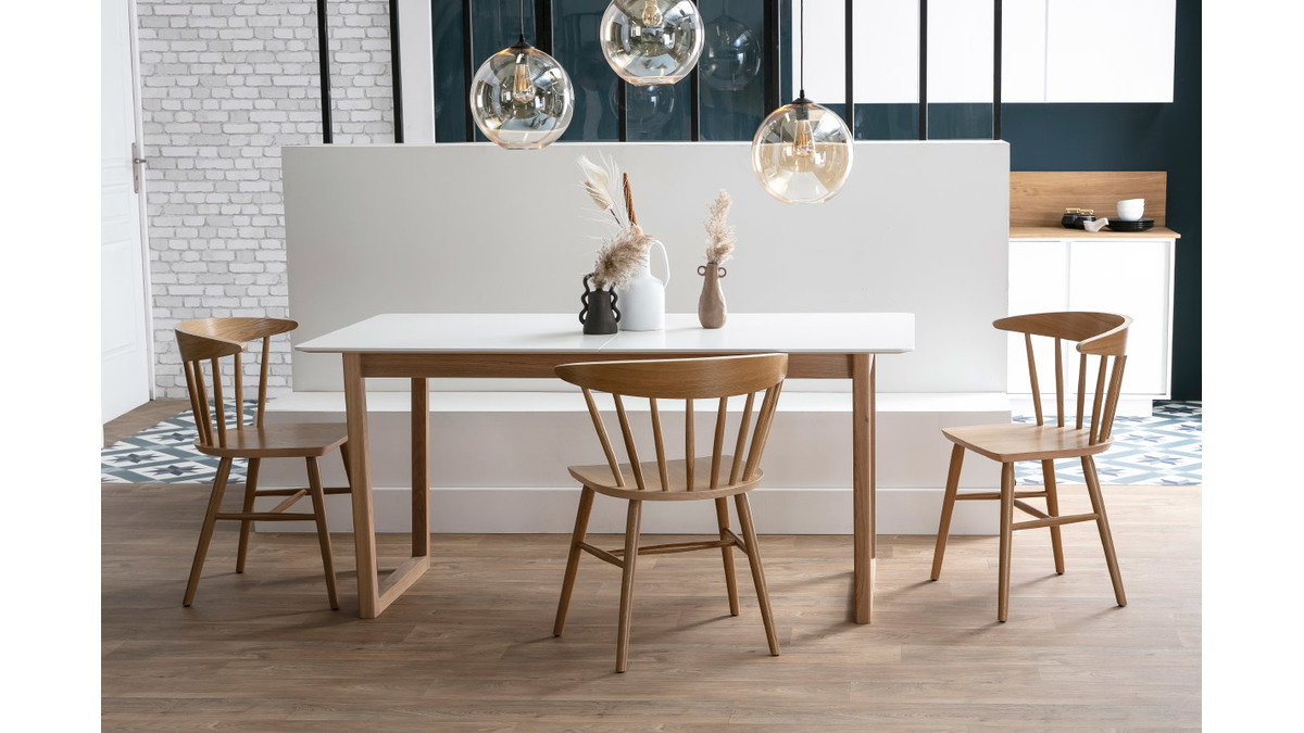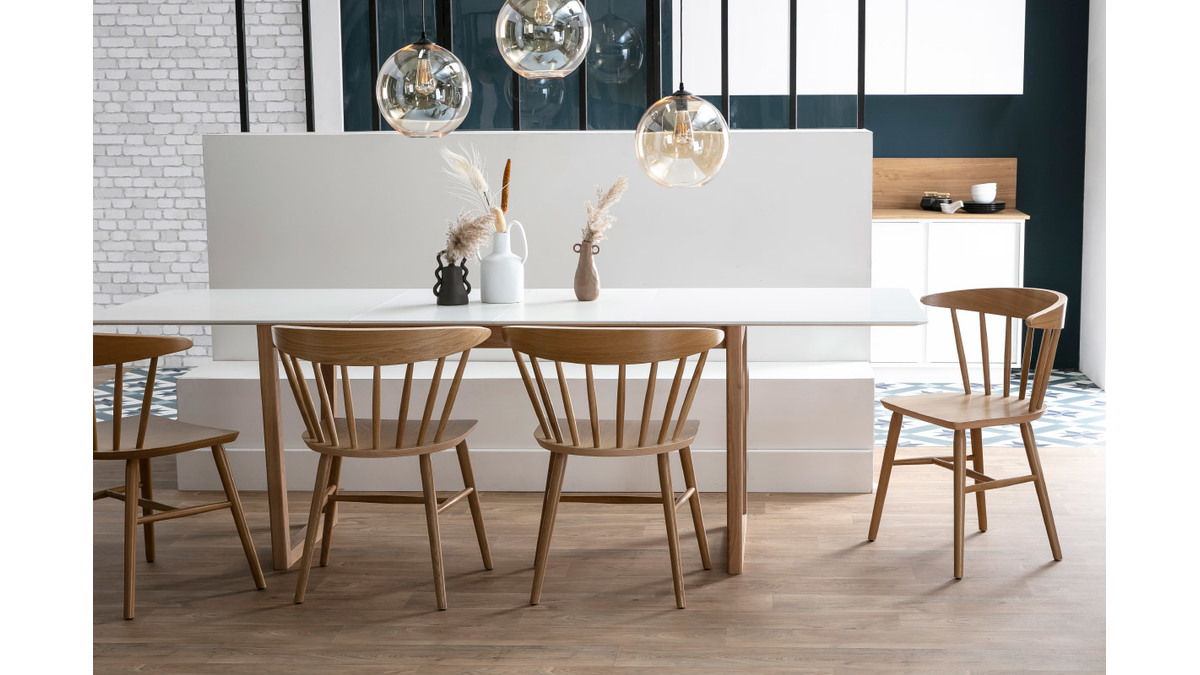 Chaleureuse et intemporelle, la table avec rallonges intégrées LAHO associe un grand plateau en panneaux de fibre de bois et un solide piètement en chêne massif. On aime la douceur de ses lignes associée à la chaleur du bois ! Une laque blanc mat est apposée sur le plateau et permet de nourrir et protéger les panneaux.