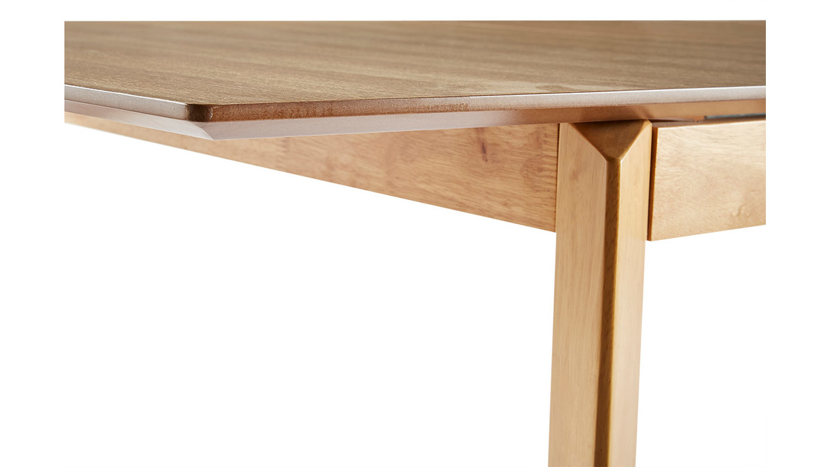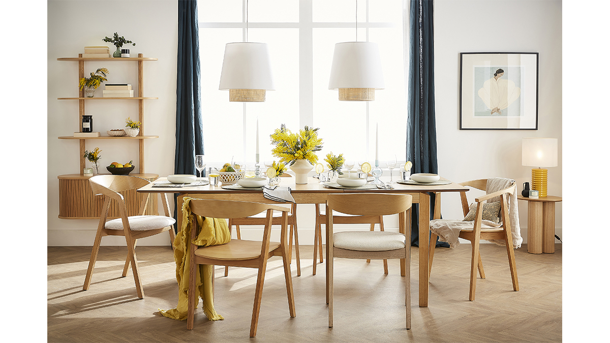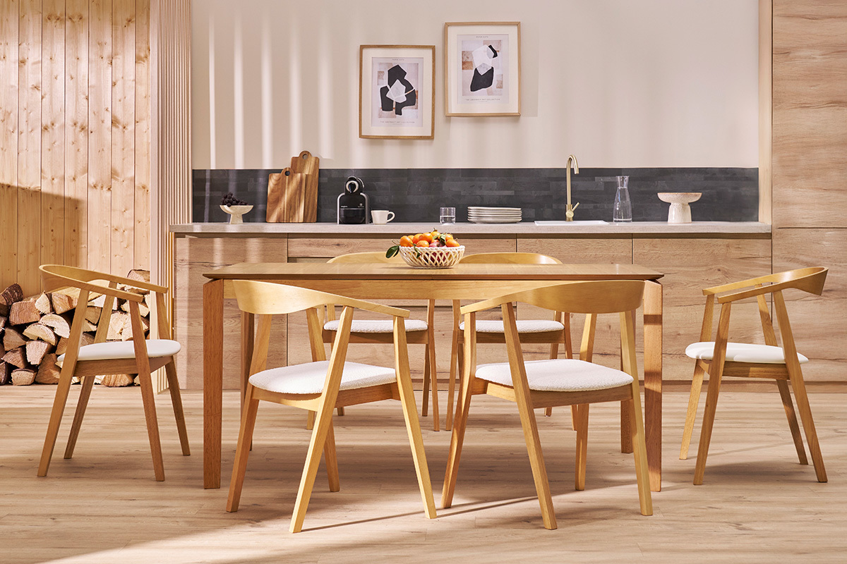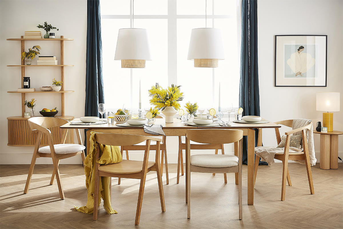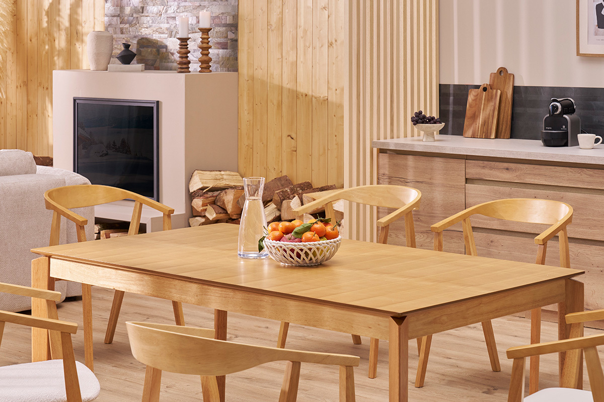 La table extensible BONAVISTA associe un plateau en frêne (L160 à 210 cm) à un piètement en hévéa massif. Le placage en frêne offre un rendu naturel et se démarque par ses veines linéaires marquées et ses jolies nuances dorées.