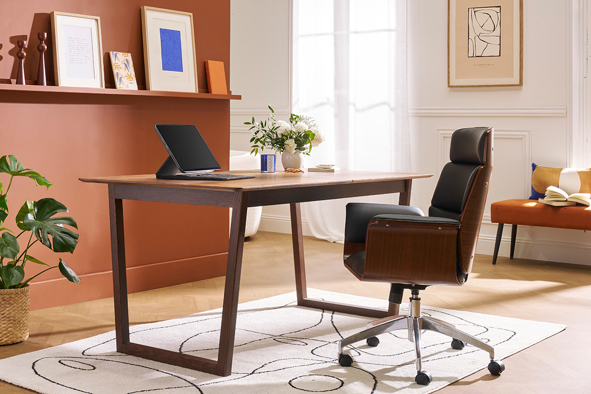 Chaleureuse et intemporelle, la table LAHO associe un plateau plaqué noyer à un solide piètement en chêne massif teinté. On aime la douceur de ses lignes associée à la chaleur du bois !