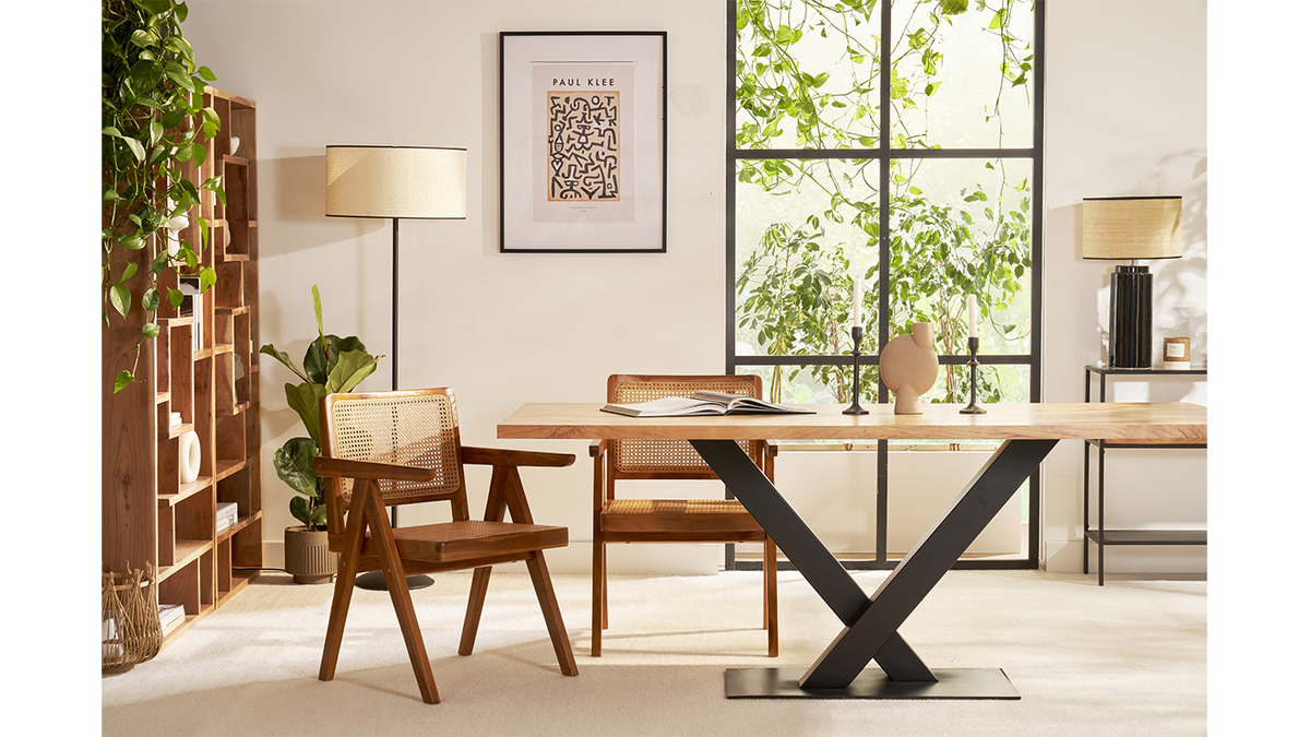 Style débridé, prédominance des matières brutes, look 100 % factory : la table à manger VALLEY se démarque par l'originalité de son piètement central.