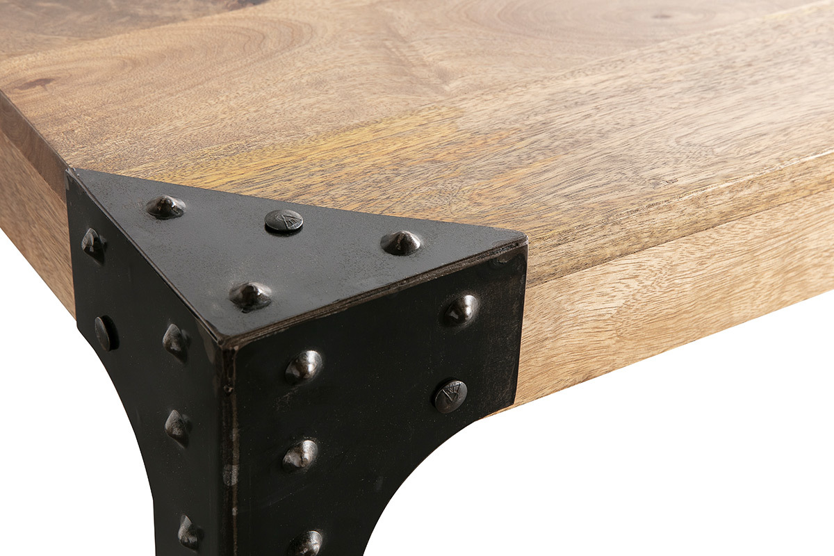 Les pieds en métal noir en imposent et mettent parfaitement en valeur les veines du manguier massif. Le manguier apporte immédiatement une touche chaleureuse à votre intérieur grâce à sa belle couleur orangée. Les détails des rivets apparents sur les côtés viennent renforcer le côté industriel et brut.
