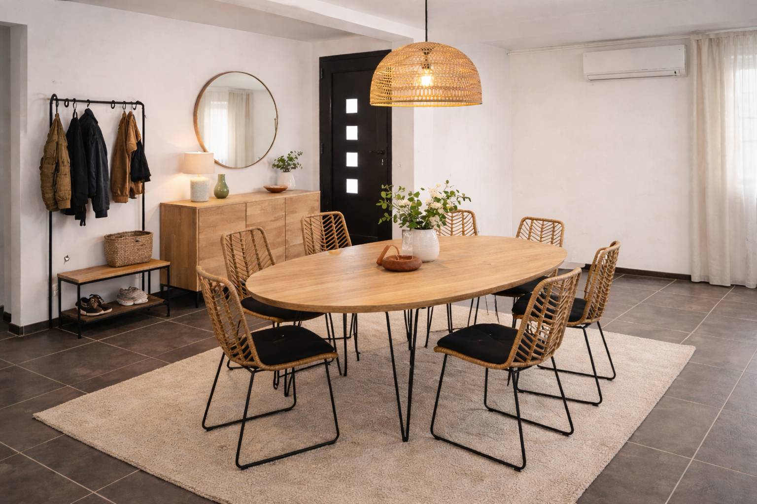 Conviviale par excellence, cette table ovale s'intègre dans tous les décors. On l'imagine aussi bien dans une salle à manger bohème que dans une cuisine au style loft vintage. Aménagez un coin repas pile dans la tendance en associant la table à manger VIBES aux chaises en rotin Malacca.