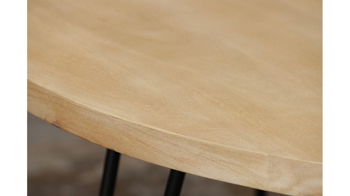 La collection VIBES affirme son côté industriel en mettant en avant le manguier, associé à des pieds en épingle noirs. Bois massif oui, mais son visuel est loin de l'être grâce à la légèreté qu'apporte la finesse de ses pieds. J'ai imaginé ces meubles avec des proportions adaptées aux petits espaces, tout en restant très fonctionnels.