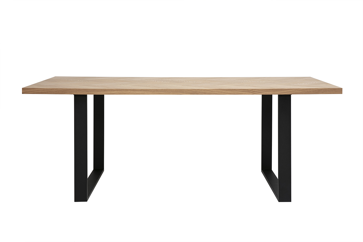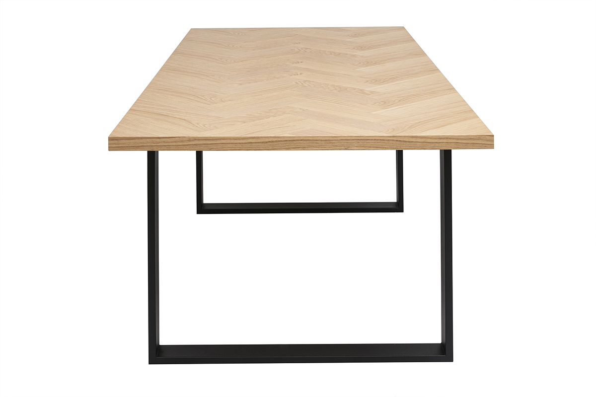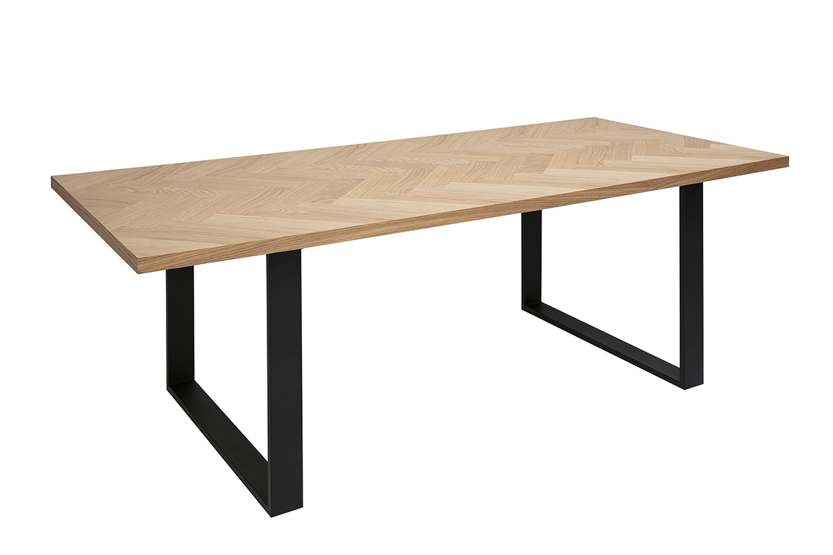 La MAGDA séduit par son plateau finition bois chêne clair, sublimé par un motif en chevrons qui apporte une touche graphique et chaleureuse à votre intérieur. Le veinage apparent et la teinte du bois confèrent à cette table une allure authentique et contemporaine. Sa surface généreuse (L200 x P90 cm) permet de disposer facilement plats, vaisselle et décoration sans jamais manquer de place.