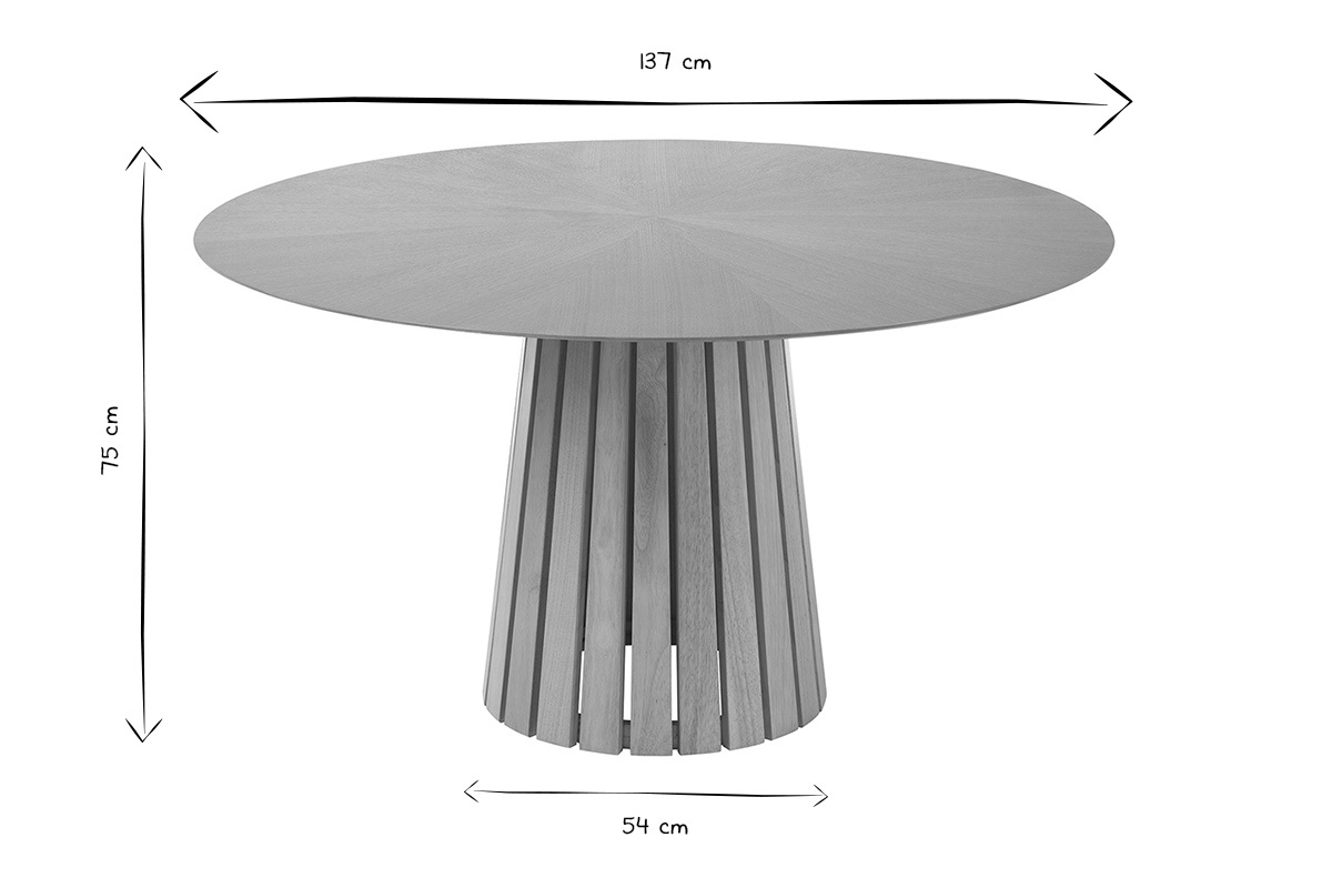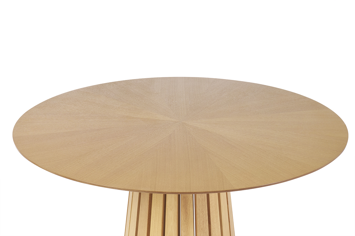 Au-delà de son esthétique remarquable, cette table ronde repose sur un piètement central au design sculptural. Réalisé en hévéa massif, ce pied conique à lattes verticales apporte une touche architecturale audacieuse et assure une parfaite stabilité. Il libère l’espace sous la table, offrant un confort optimal pour les convives tout en affirmant une silhouette élancée et moderne.