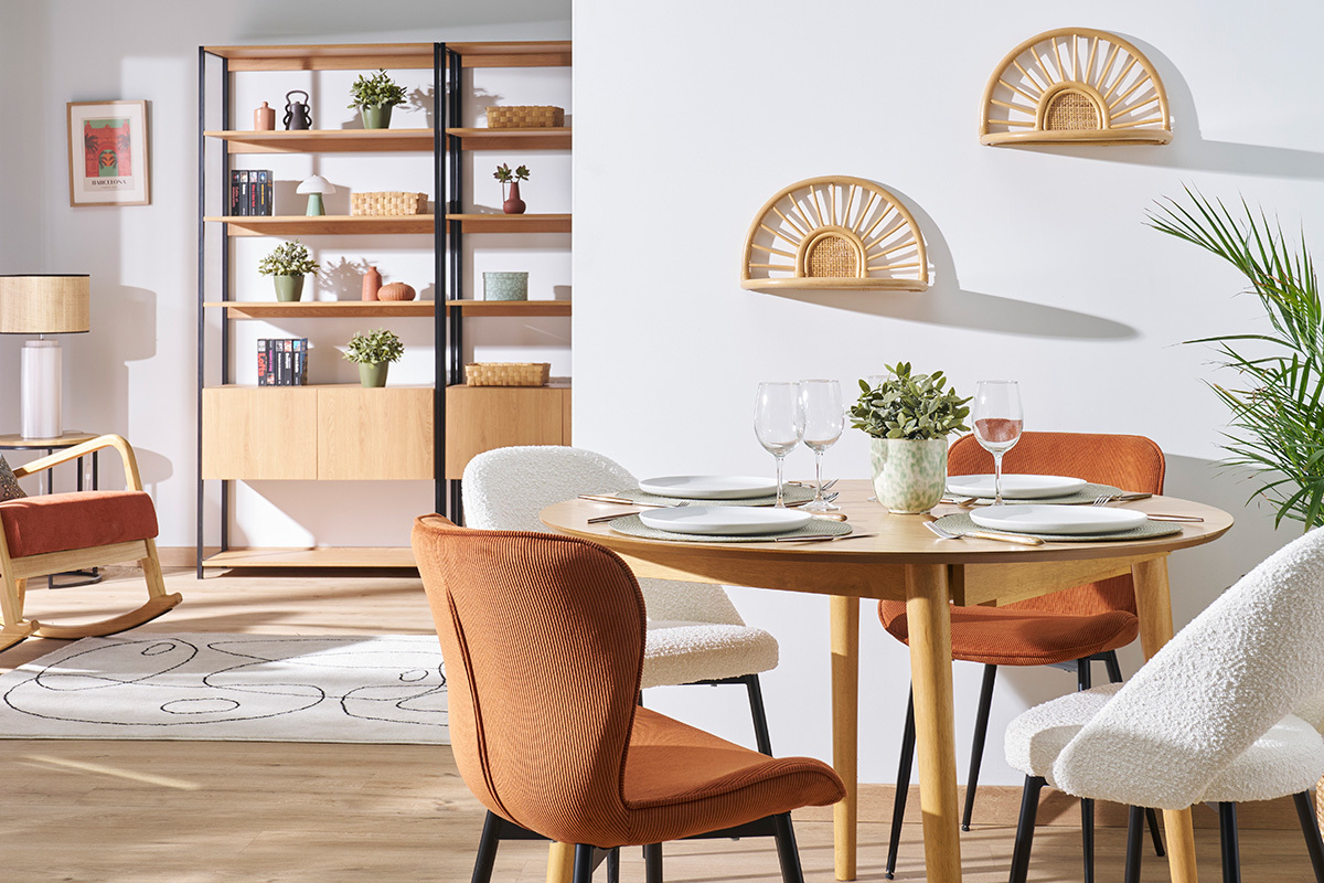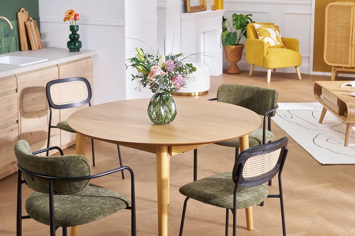 Ambiance chalet de montagne, maison de campagne ou tendance japandi, cette table à rallonge ronde 4-6 personnes s'apprête à faire le bonheur des intérieurs douillets et chaleureux... où il fait bon se retrouver ! Définissez l'ambiance souhaitée pour vos plans de table grâce à une grande suspension design justement positionnée pour mettre en valeur vos tablées.