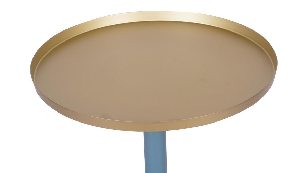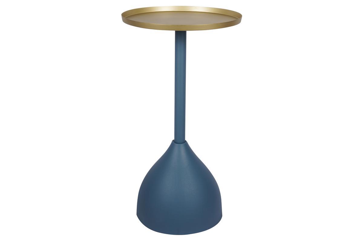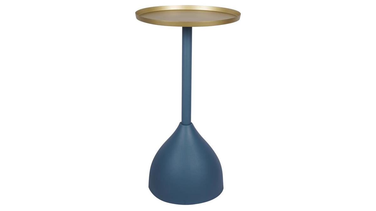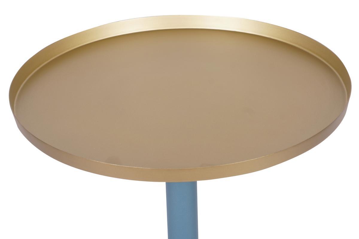 Avec sa forme sculpturale réalisée à partir de métal, la table d'appoint RAMSES ne laisse personne indifférent. On aime ses lignes rondes, simples et massives et le joli contraste entre son socle épais de couleur bleu pétrole mat (D28 cm) et son plateau ultrafin en métal doré brillant (D40 cm).