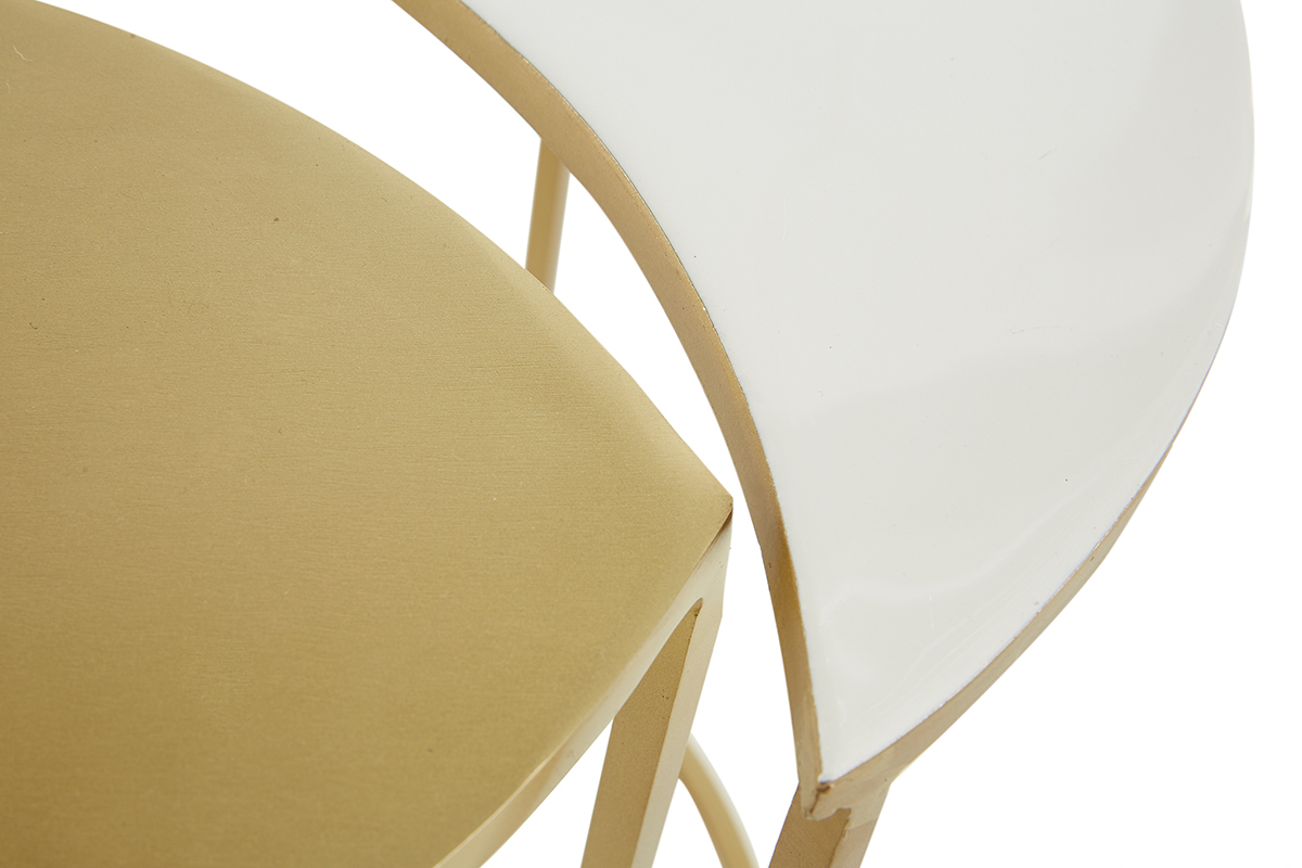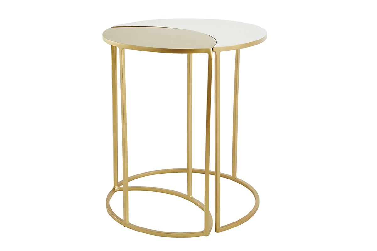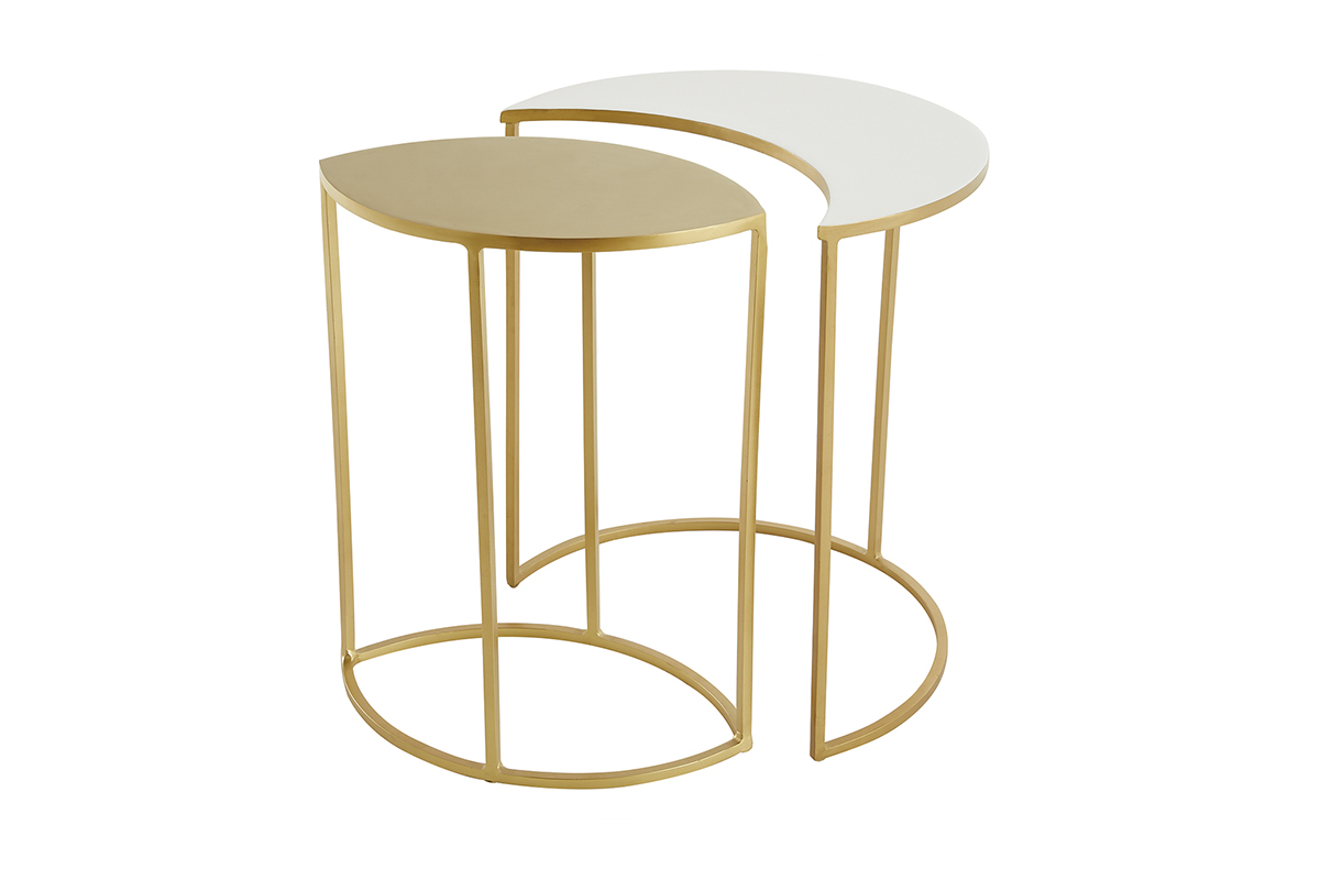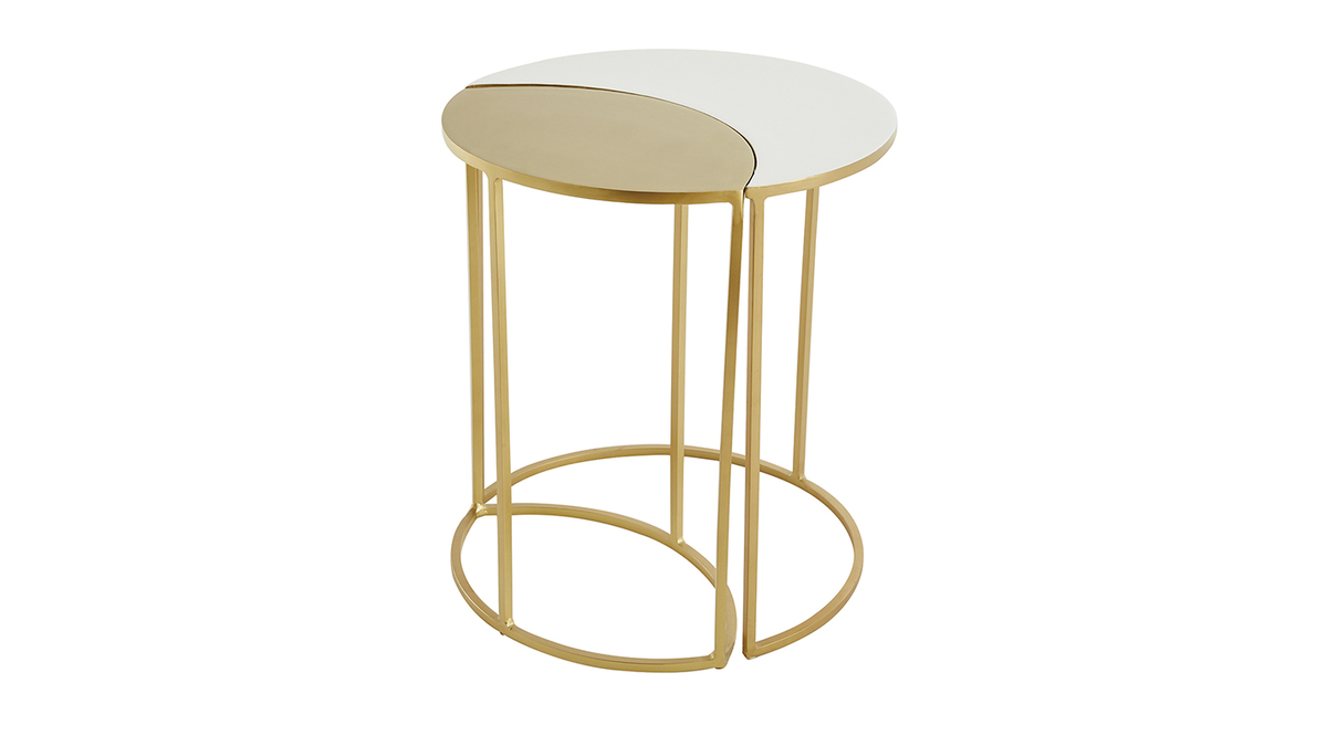 La fine structure en métal doré dessine de jolies lignes graphiques dans l'espace. Elle s'équilibre brillamment avec les plateaux (épaisseur 1 cm) en métal doré et métal laqué blanc. En résulte une silhouette singulière et délicate qui s'intègre facilement dans tous les intérieurs.