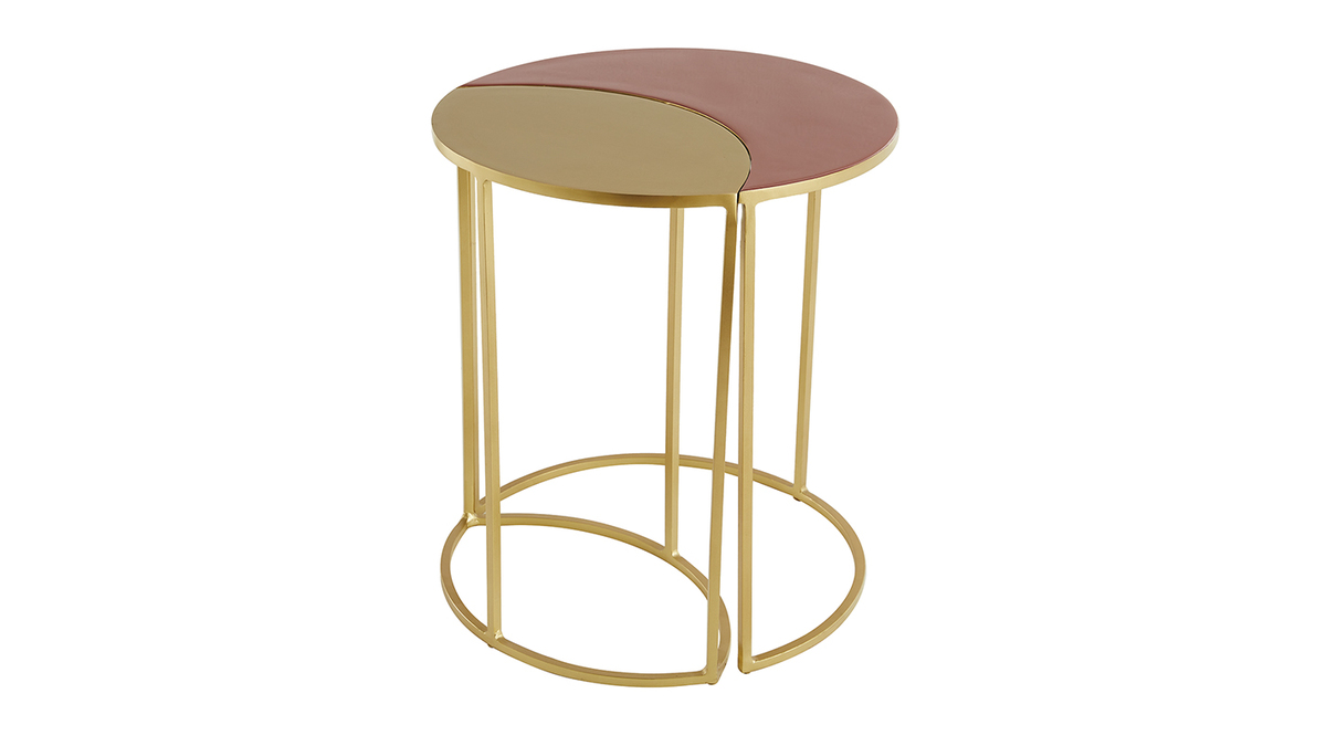 La fine structure en métal doré dessine de jolies lignes graphiques dans l'espace. Elle s'équilibre brillamment avec les plateaux (épaisseur 1 cm) en métal doré et métal laqué rose. En résulte une silhouette singulière et délicate qui s'intègre facilement dans tous les intérieurs.
