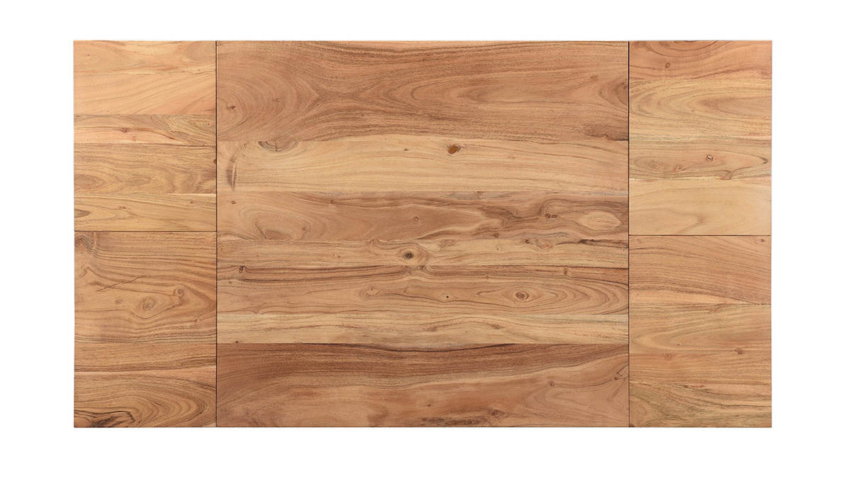 Plébiscitée pour la confection de mobilier d'intérieur, l'acacia est une essence naturellement dure et dense particulièrement esthétique. Ce bois imputrescible, se distingue par ses veinures allongées, mais également ses variations de couleurs. Avec le temps, l'exposition à la lumière et sources de chaleur, l'acacia est un bois clair dont le coloris jaune-vert à doré subit une coloration naturelle (brune, rougeoyante, reflets gris).