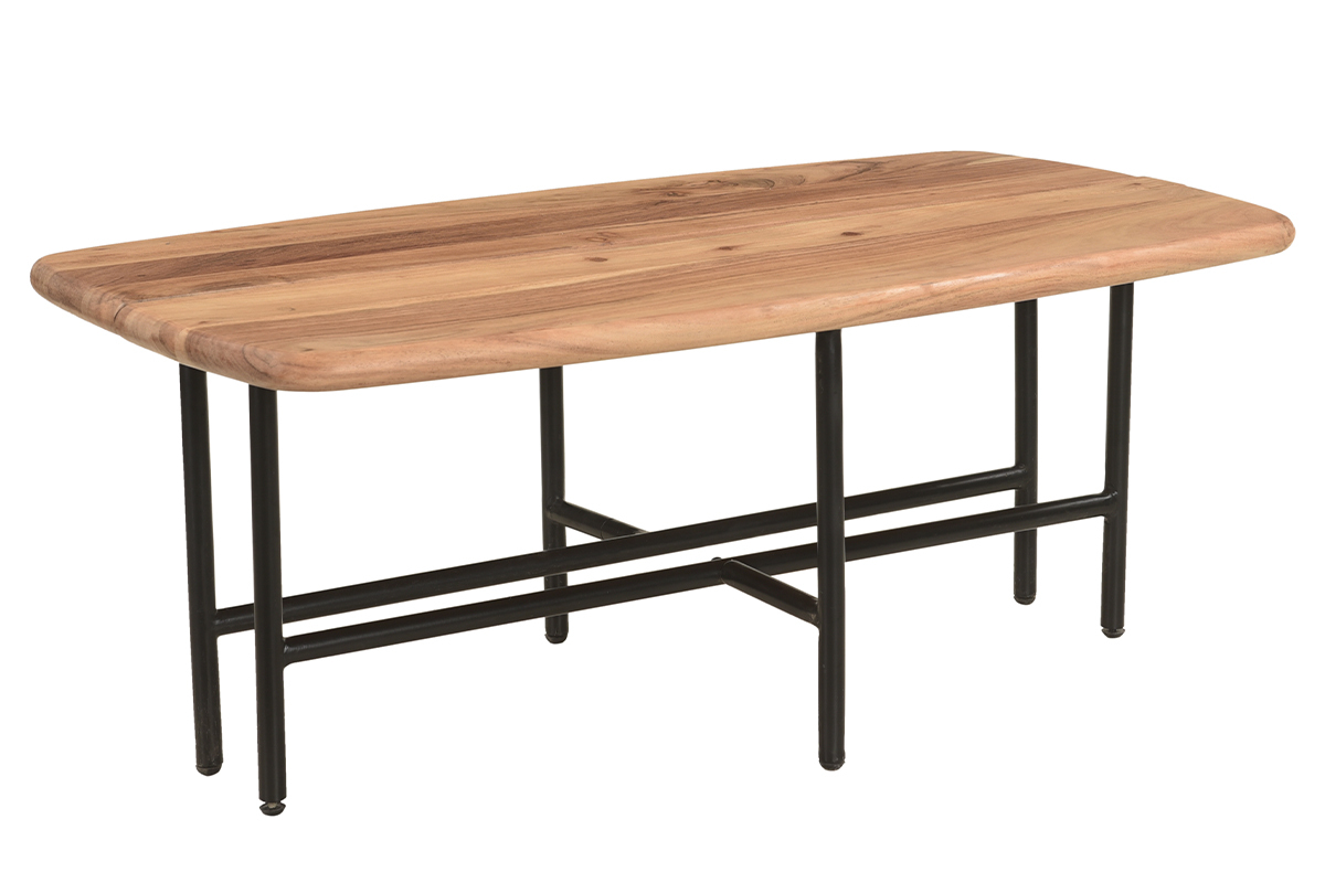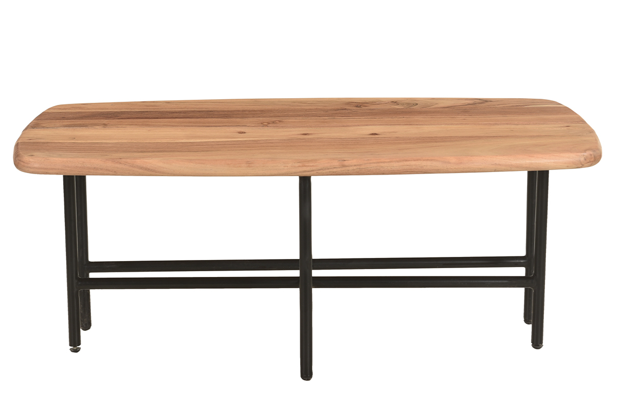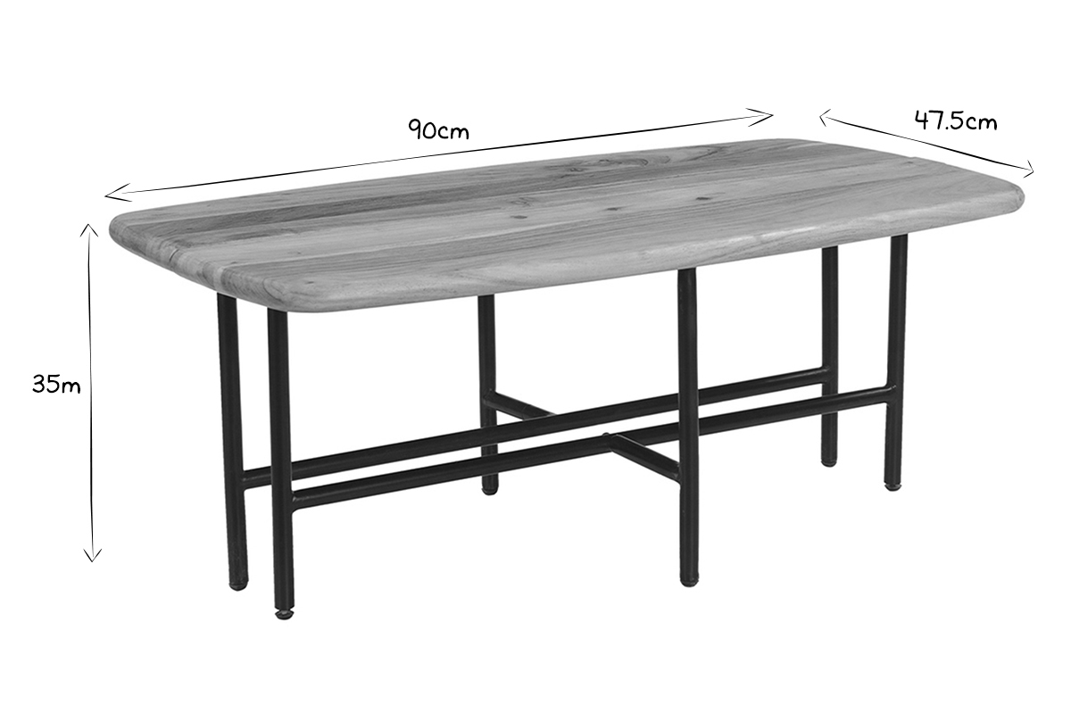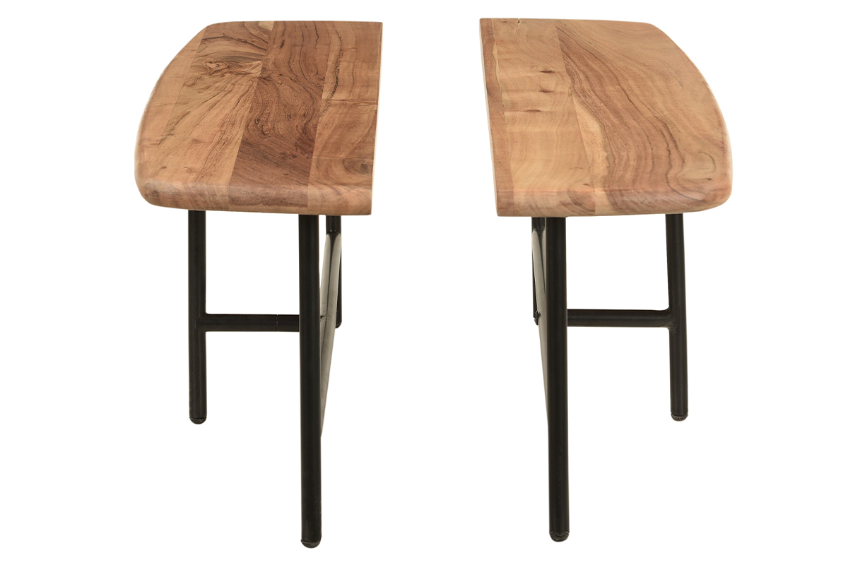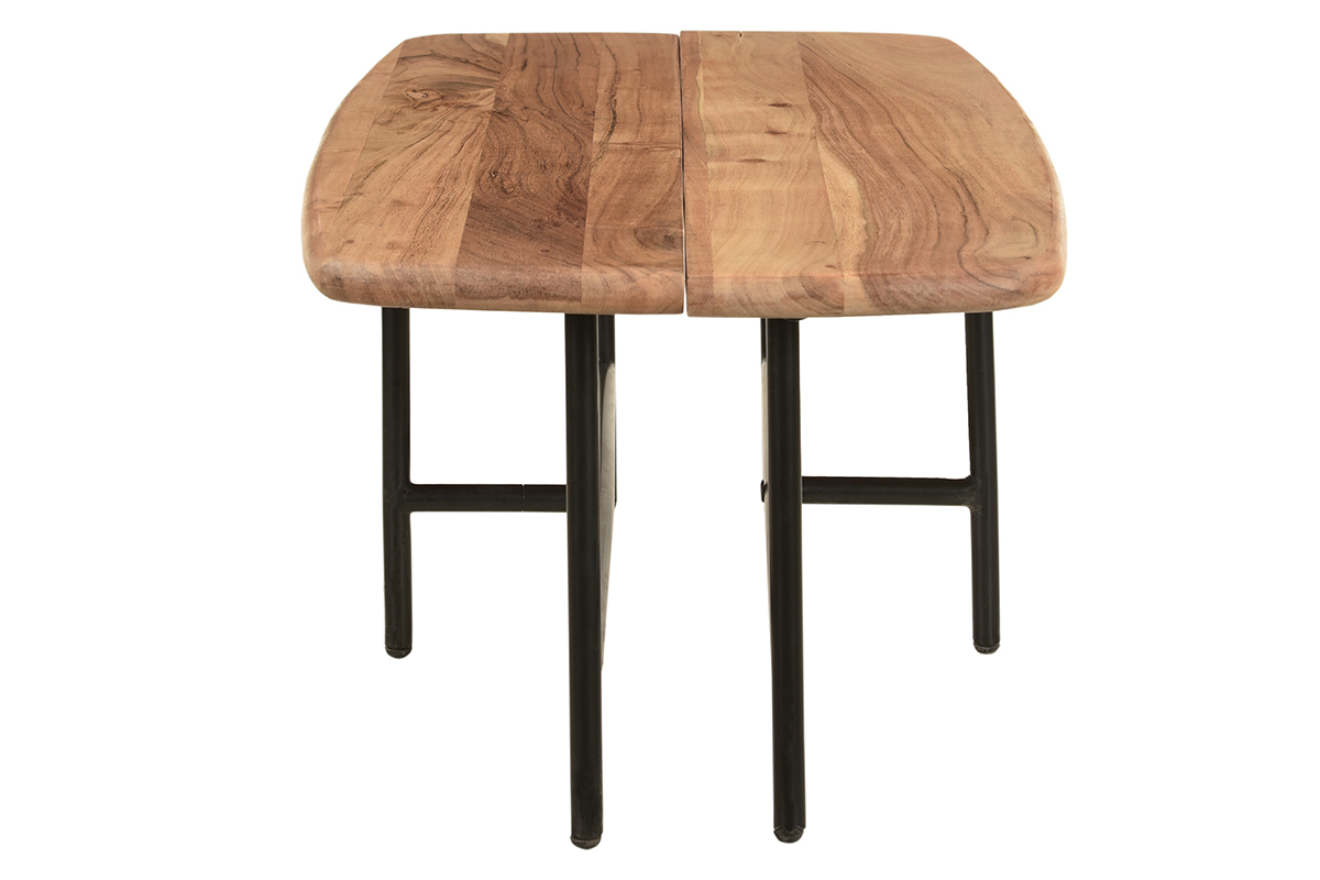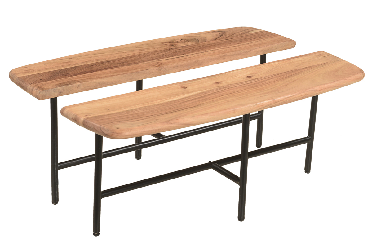 Ainsi, la structure en métal noir se limite à l'essentiel pour supporter les robustes plateaux en acacia massif.