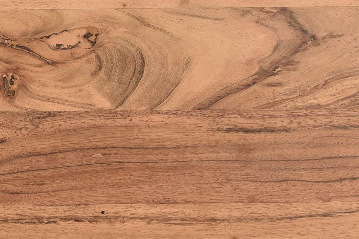 Plébiscitée pour la confection de mobilier d'intérieur, l'acacia est une essence naturellement dure et dense particulièrement esthétique. Ce bois imputrescible, se distingue par ses veinures allongées, mais également ses variations de couleurs. Avec le temps, l'exposition à la lumière et sources de chaleur, l'acacia est un bois clair dont le coloris jaune-vert à doré subit une coloration naturelle (brune, rougeoyante, reflets gris).