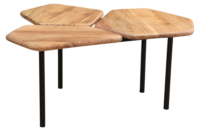Le discret piètement aux lignes élancées en métal noir, laisse visuellement sa place aux 3 plateaux ajourés en acacia massif. Le regard s'attarde alors sur l'intensité de ce bois exotique aux teintes chaudes et aux légères nuances rousses.