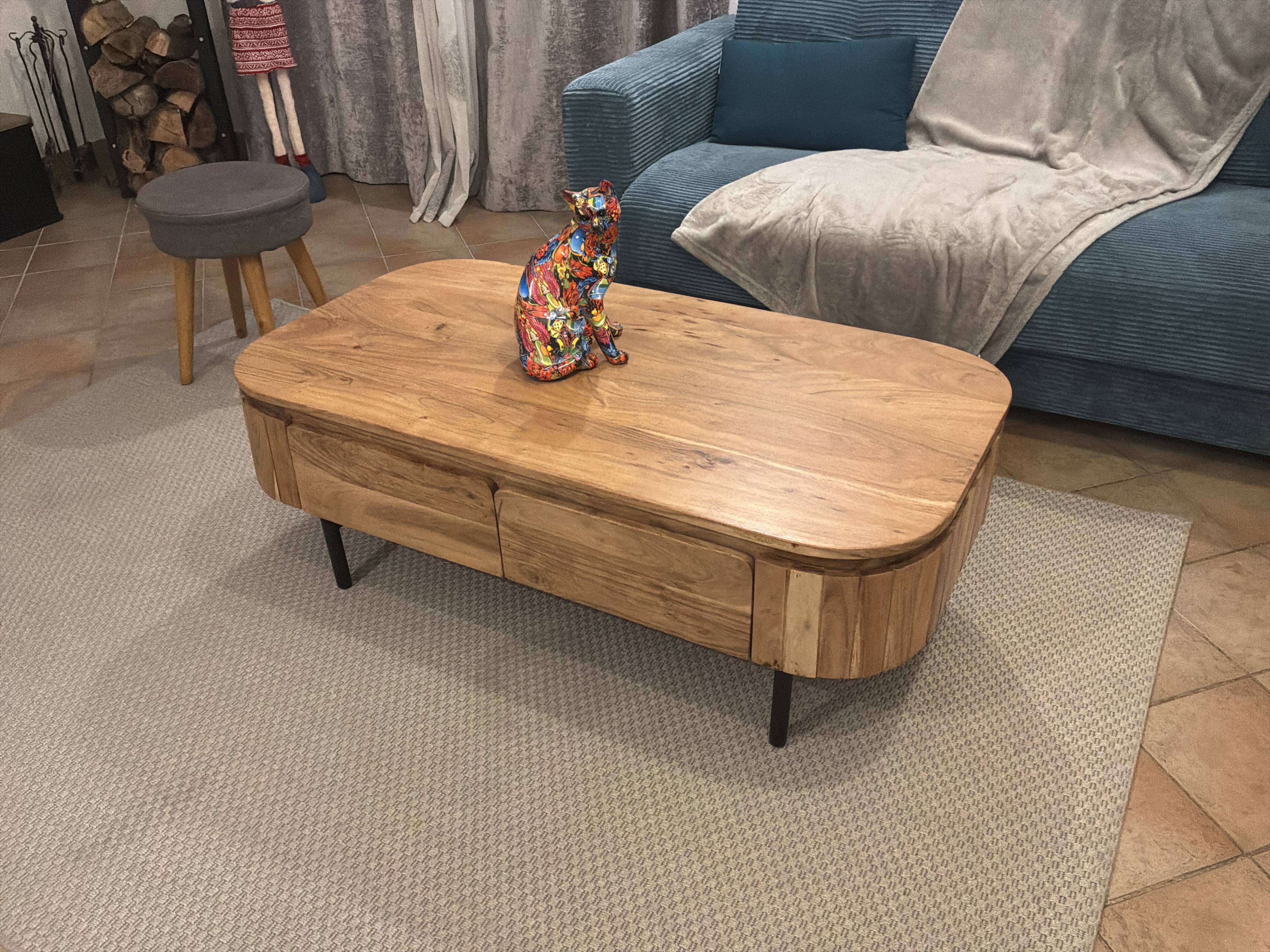 Table basse avec rangements en bois massif et métal noir 4 tiroirs livrée prête à monter. Montage simple, seuls les pieds sont à fixer.