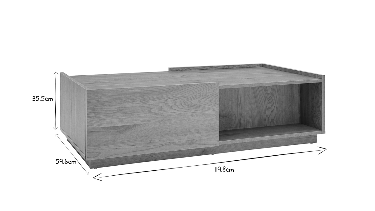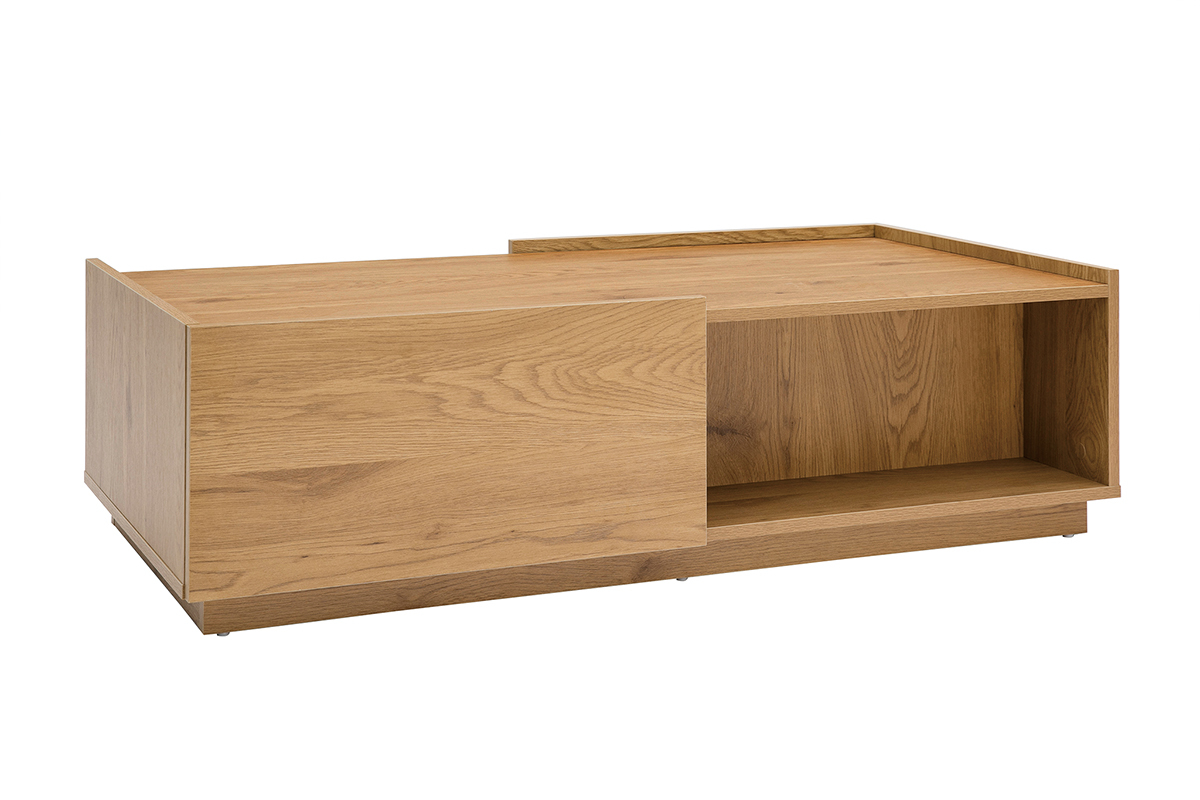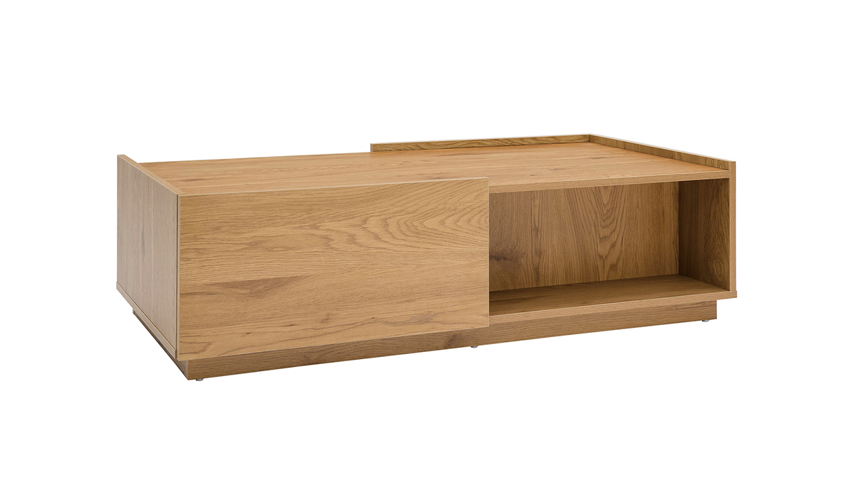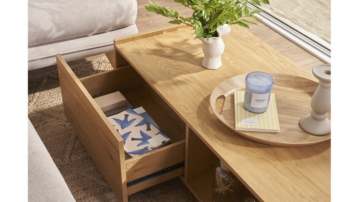 Meuble gain de place, cette table basse avec rangements, renferme de part et d'autre deux niches ouvertes (L57.3 x P18.5 x H24.2 cm) ainsi que deux grands tiroirs (dimensions intérieures : L52.9 x P33.6 H13.2 cm). De quoi ranger sans tout cacher ! Pour parfaire l'esthétique épurée de ce meuble deux en un, les caissons sont dépourvus de poignées.