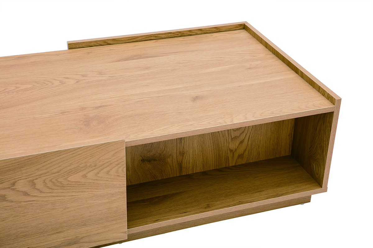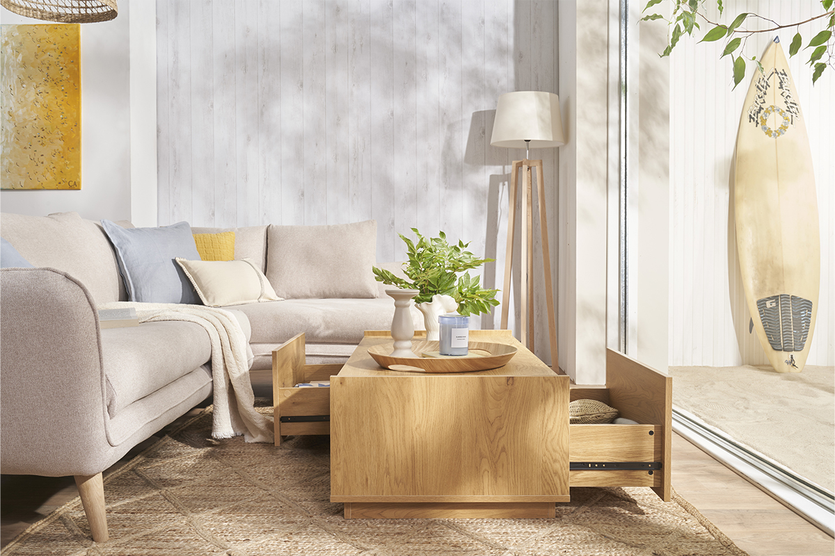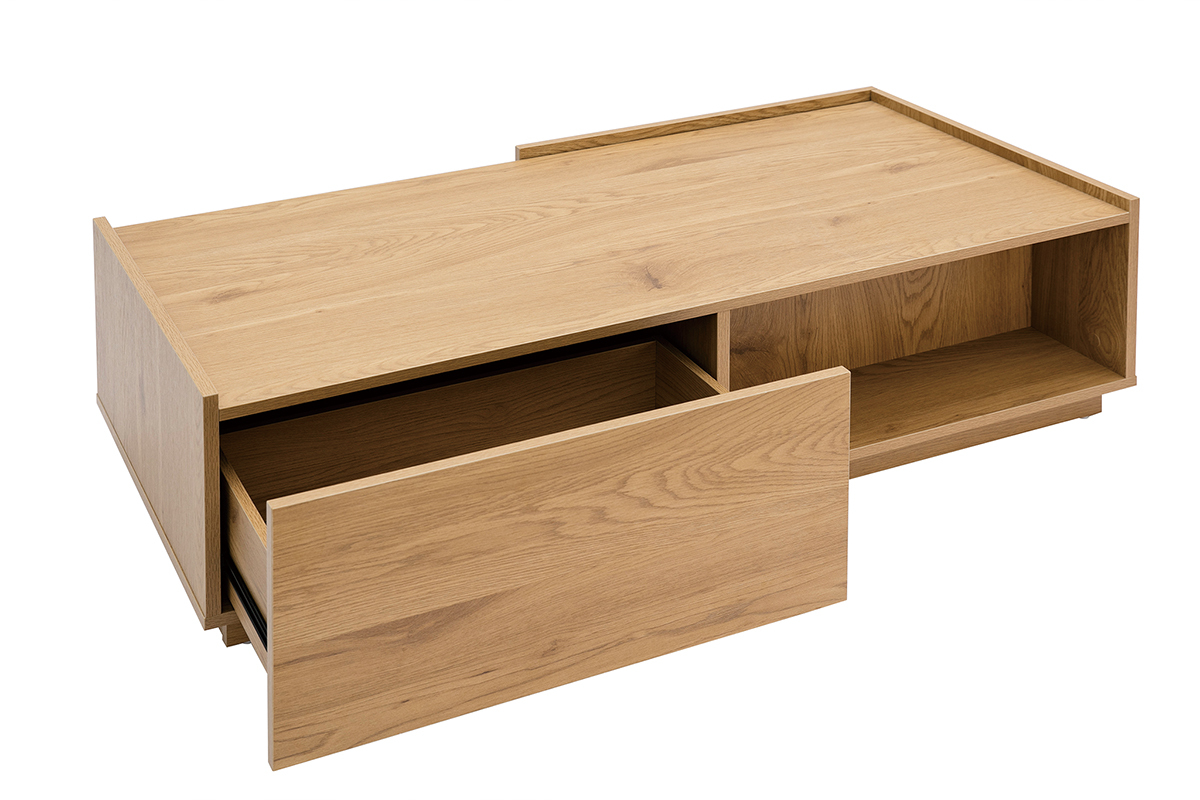 Meuble gain de place, cette table basse avec rangements, renferme de part et d'autre deux niches ouvertes (L57.3 x P18.5 x H24.2 cm) ainsi que deux grands tiroirs (dimensions intérieures : L52.9 x P33.6 H13.2 cm). De quoi ranger sans tout cacher ! Pour parfaire l'esthétique épurée de ce meuble deux en un, les caissons sont dépourvus de poignées.