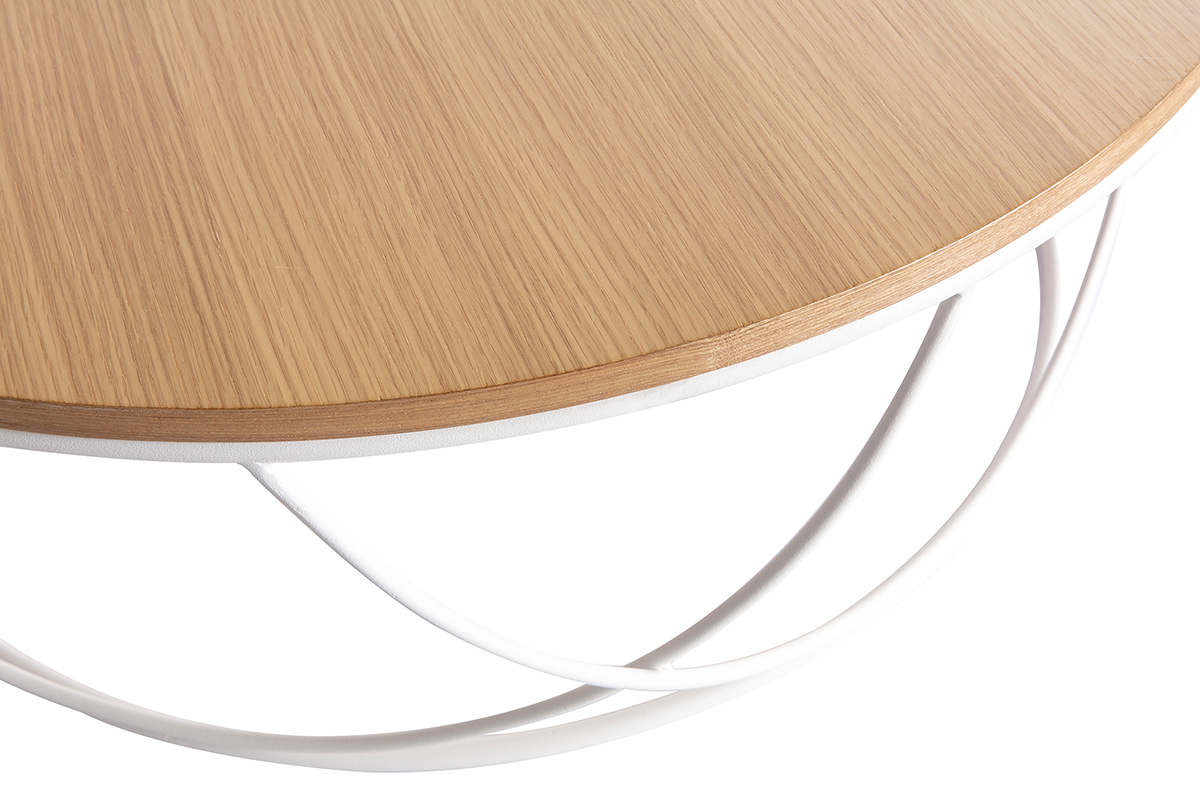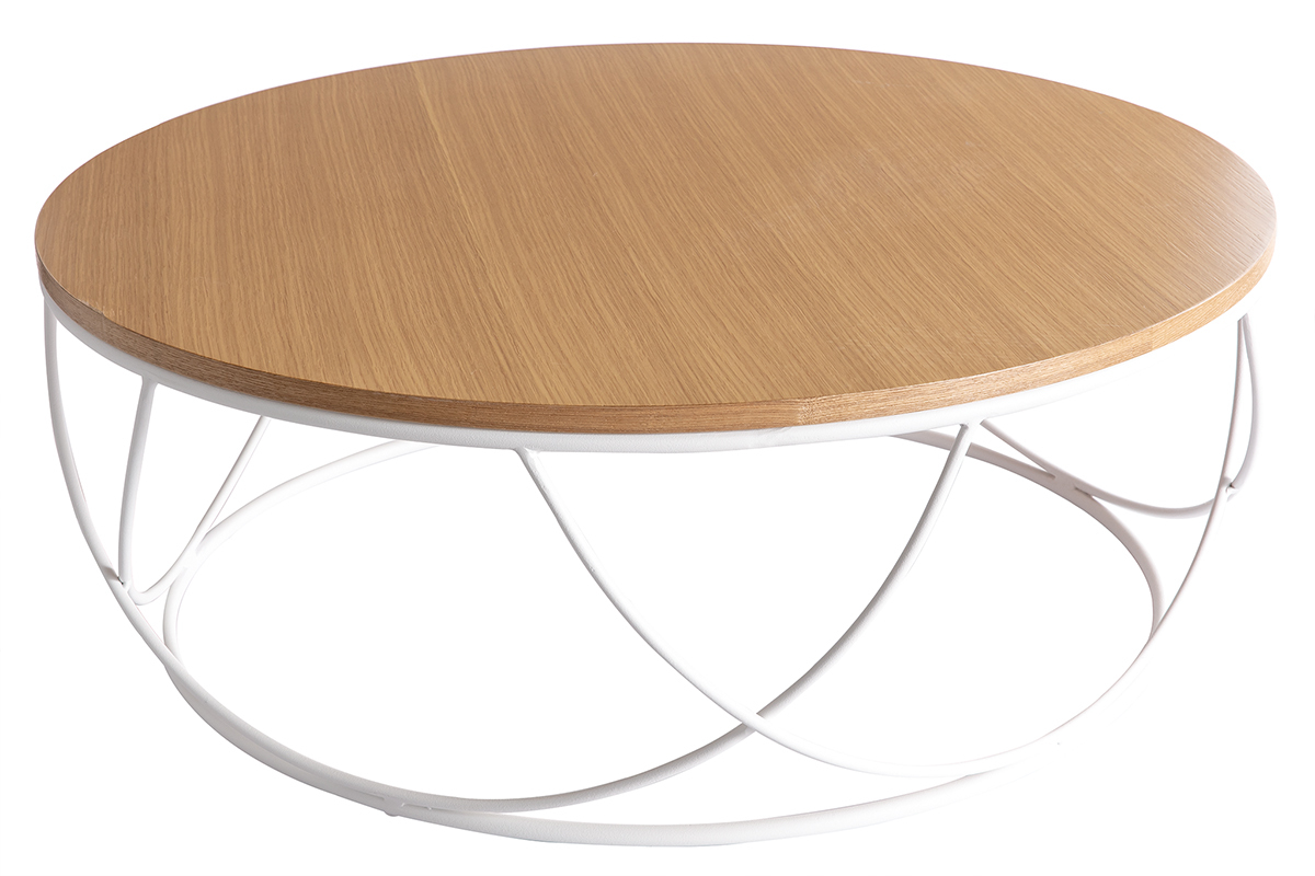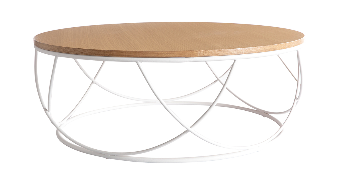 Alliance réussie d'un plateau en fibres de bois placage chêne et d'une base ajourée faite d'arceaux métalliques, ce modèle de table basse en bois clair et métal blanc apportera un charme fou à votre intérieur ! Voilà une grande table basse ronde sans pieds (L80 x L80 x H30 cm) qui mixe modernité des lignes et inspiration scandinave !