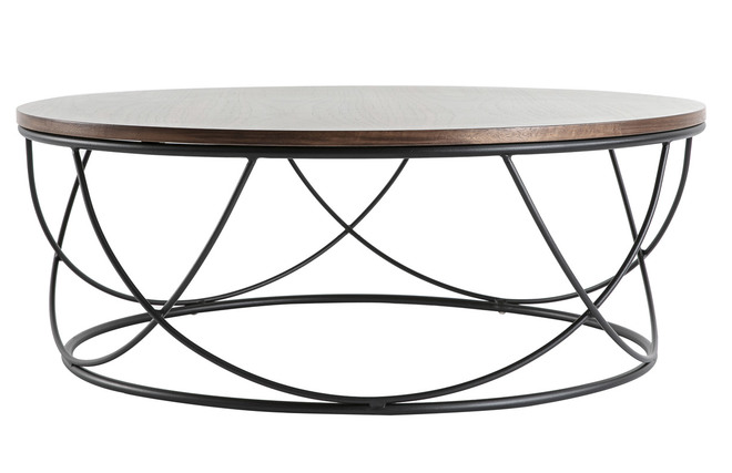 Alliance réussie d'un plateau en fibres de bois placage noyer et d'une base ajourée faite d'arceaux métalliques, ce modèle de table basse en bois foncé et métal noir apportera un charme fou à votre intérieur ! Voilà une grande table basse ronde sans pieds (L80 x L80 x H30 cm) qui mixe modernité des lignes et look industriel !