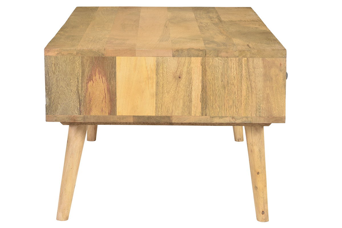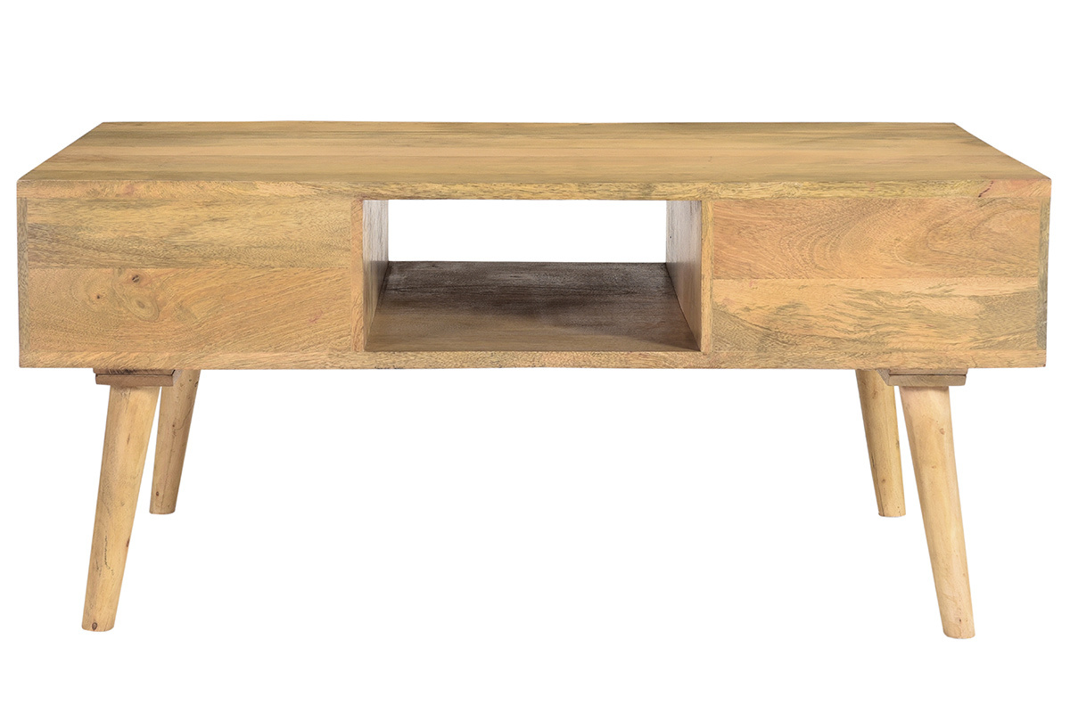 La table bassse WALTER est un meuble de salon en bois massif dont on apprécie aussi bien l'aspect naturel que la solidité. Elle est équipée de deux tiroirs et d'une niche centrale pour que télécommandes, magazines et affaires du quotidien n'encombrent pas sa surface.