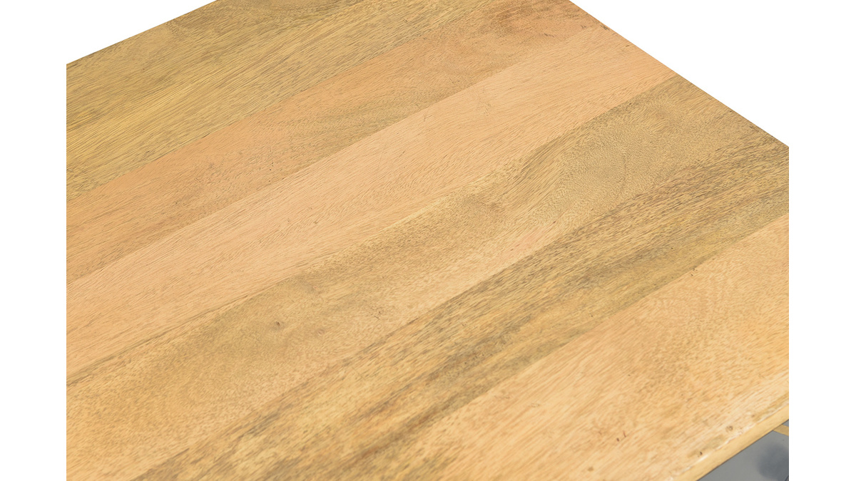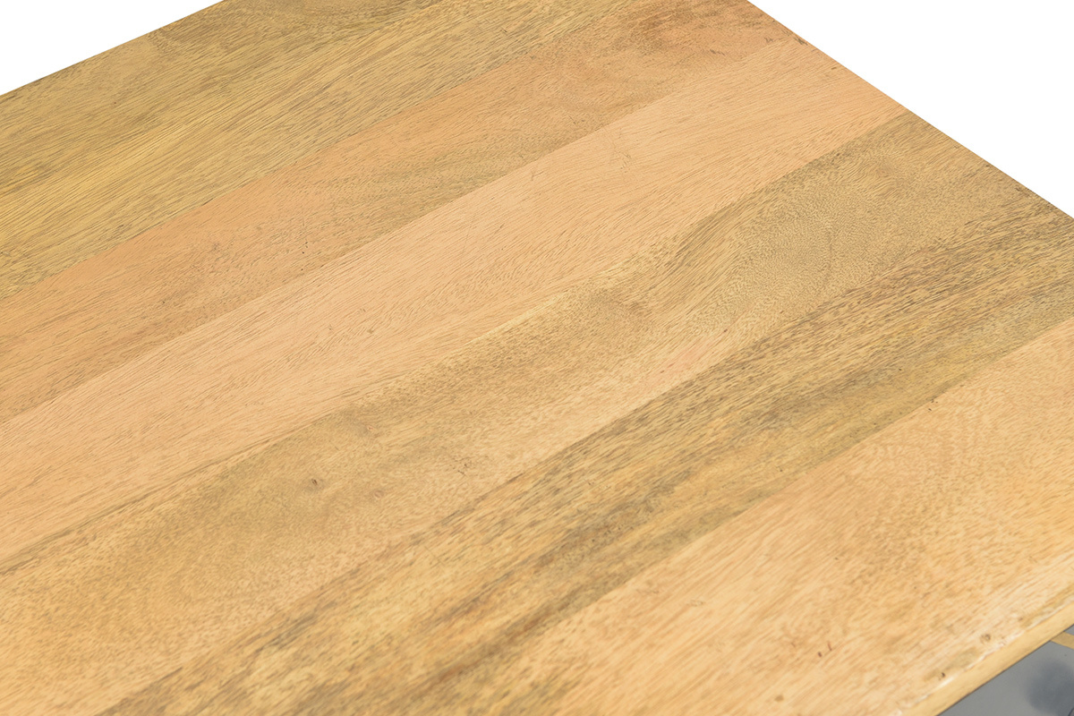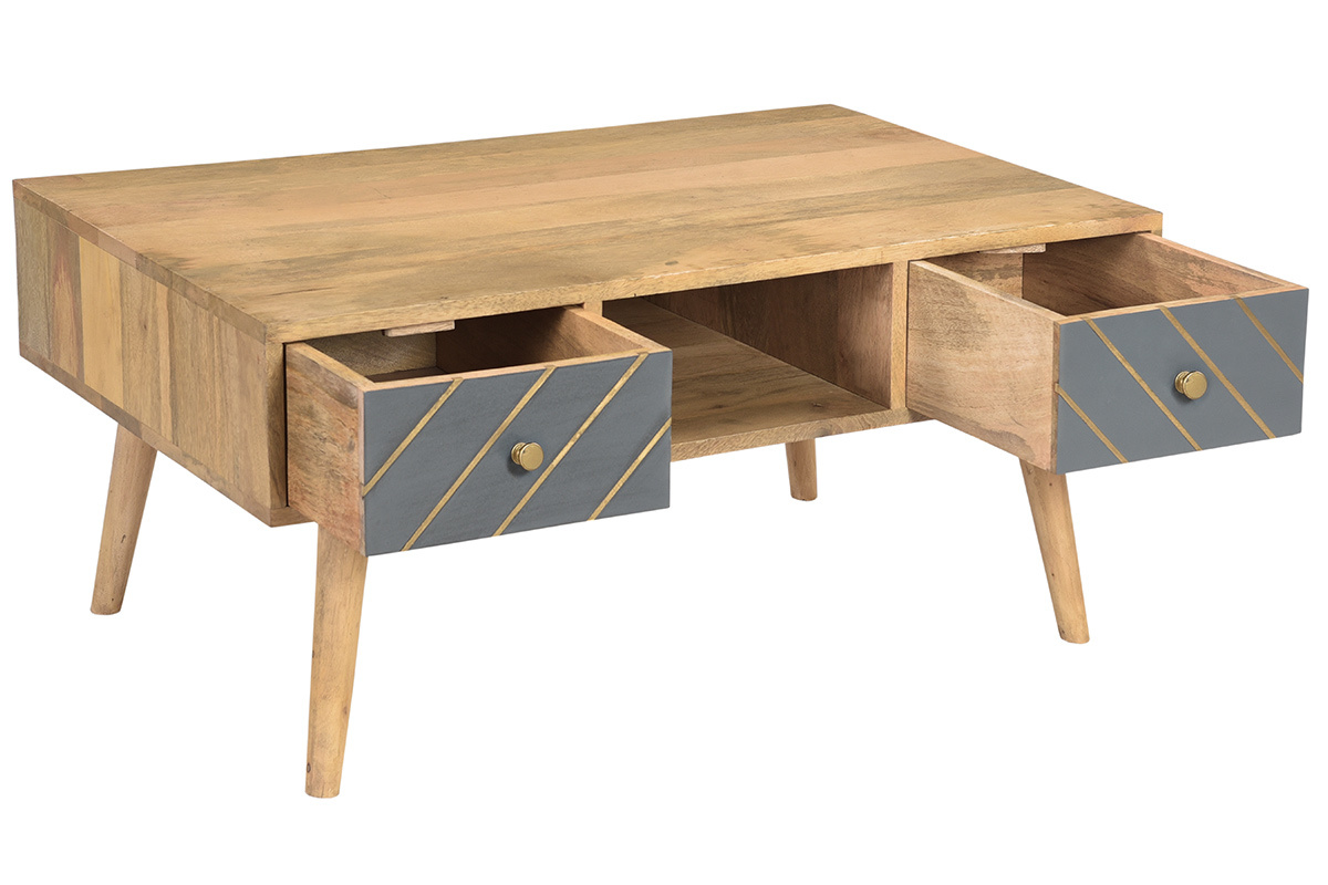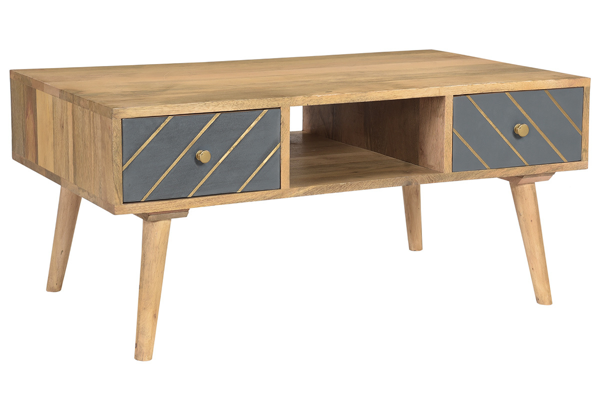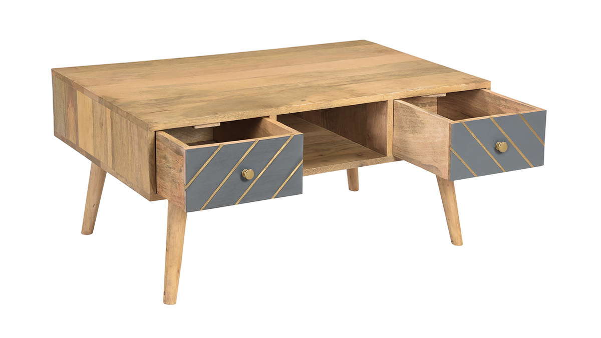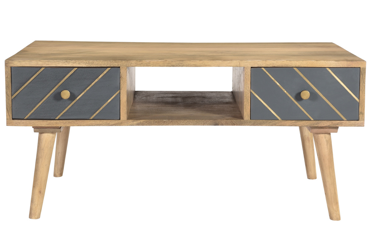 Cette table basse associe un ensemble de rangements pratiques et un style incroyable. Véritable petit bijou d'authenticité, elle est faite pour occuper une place centrale dans le salon. C'est une pièce conçue artisanalement au charme brut. Le travail manuel du manguier et des façades de tiroirs en fait un objet déco unique. On aime particulièrement le mariage entre cette essence de bois exotique aux nervures caractéristiques et le motif graphique gris et doré au rendu si moderne.