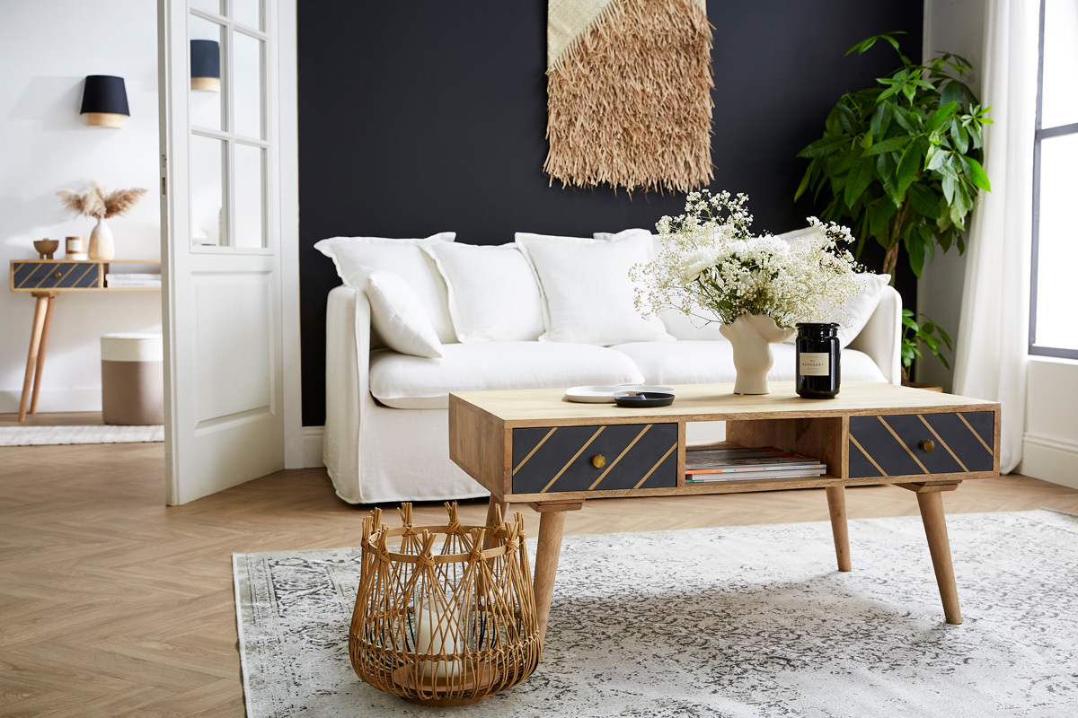 Artisanale et originale, la table basse 2 tiroirs WALTER marque les esprits !
