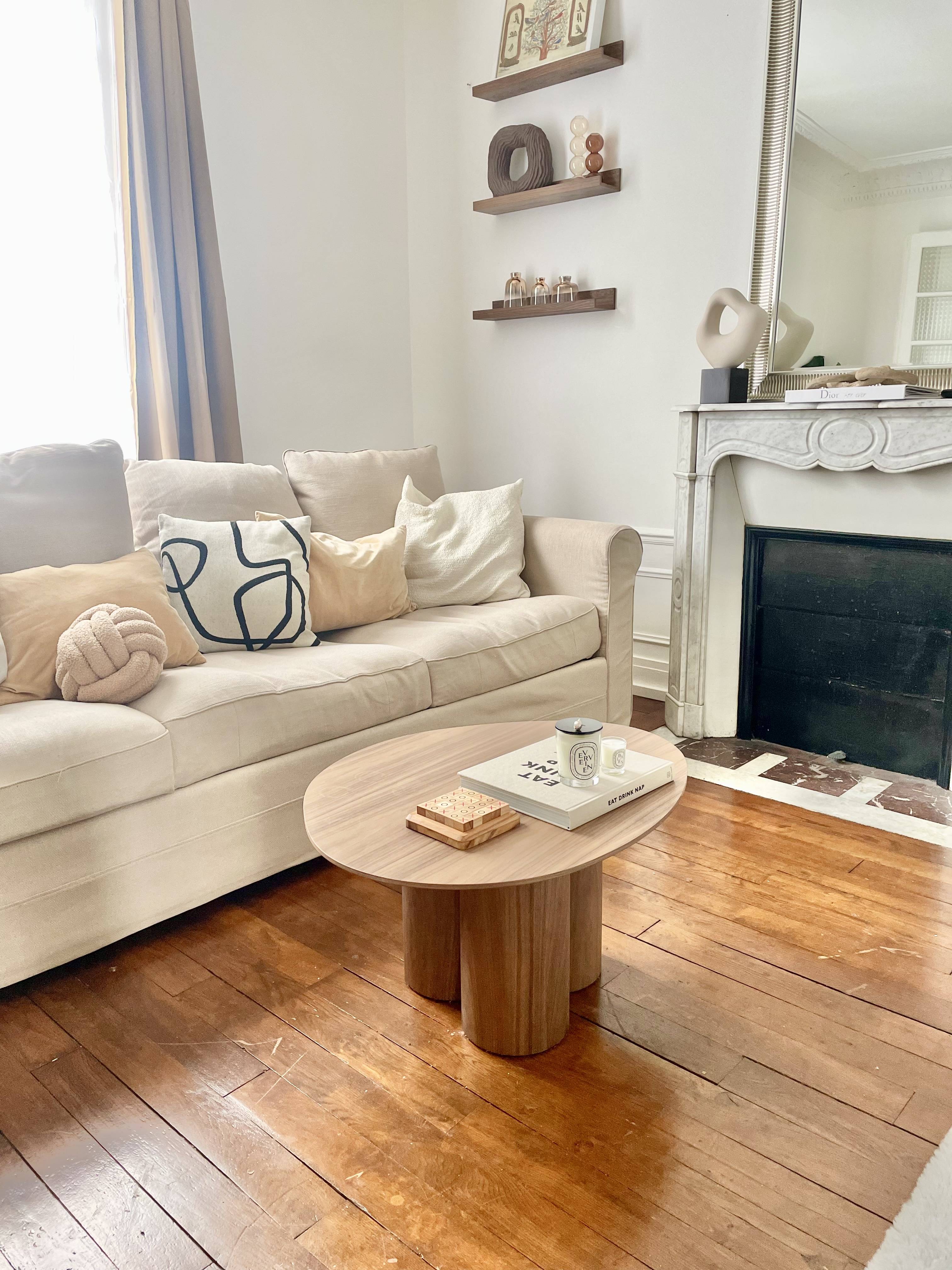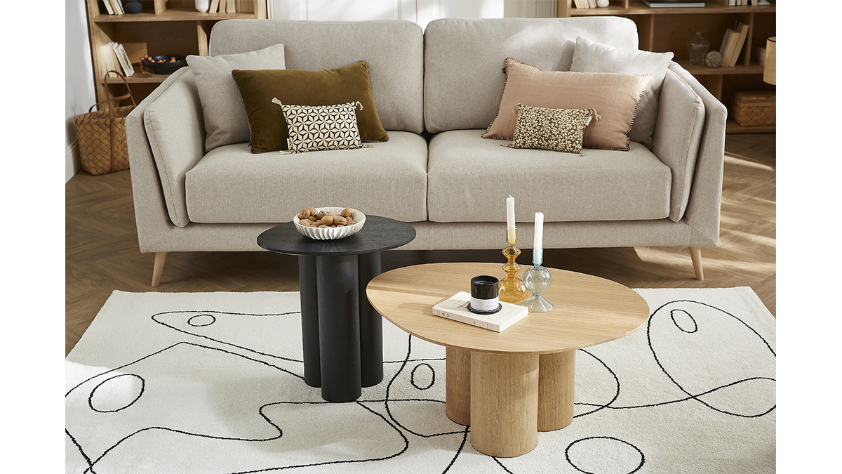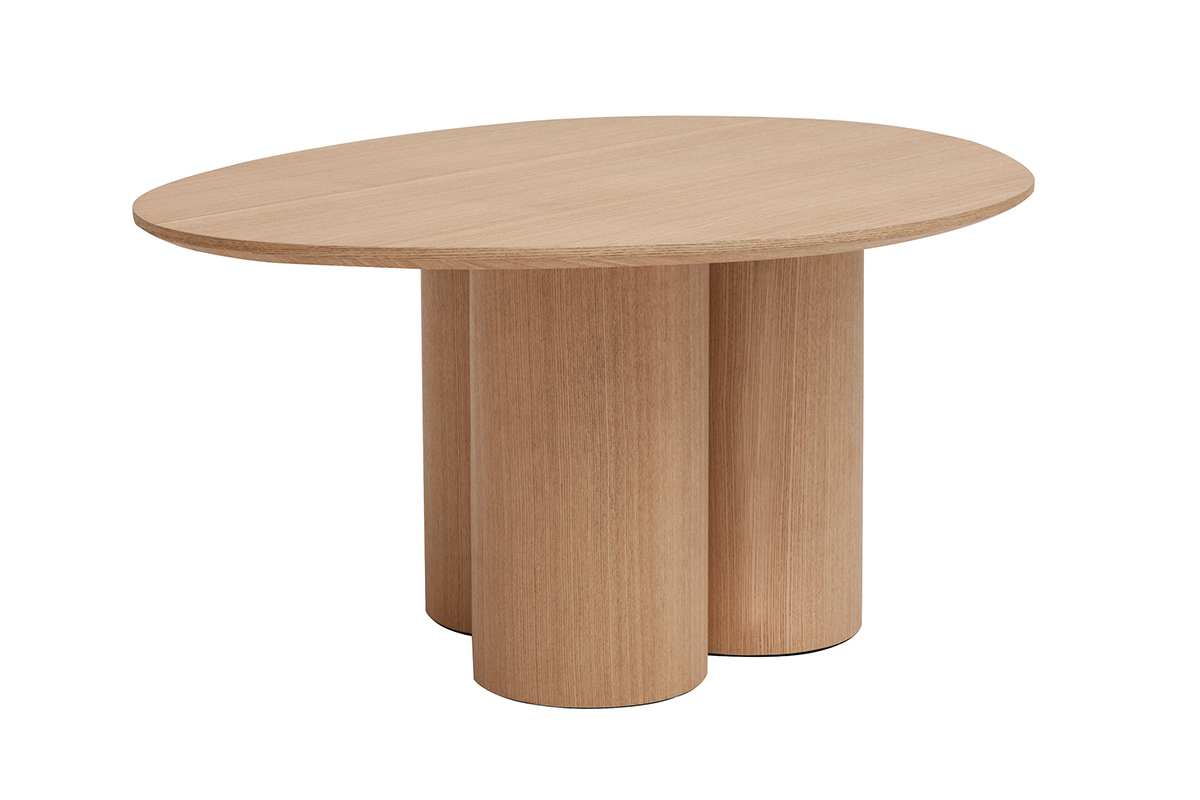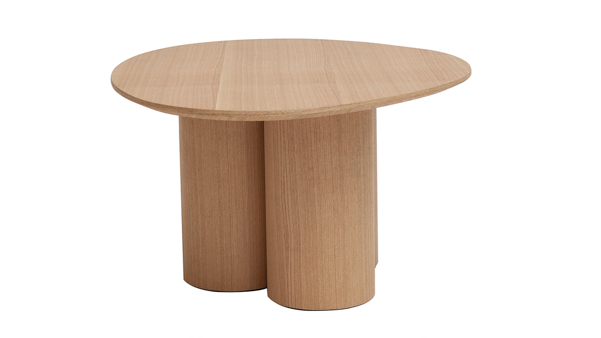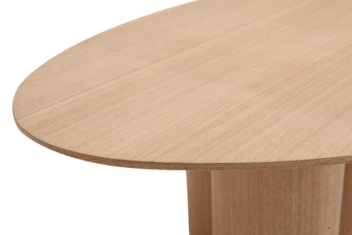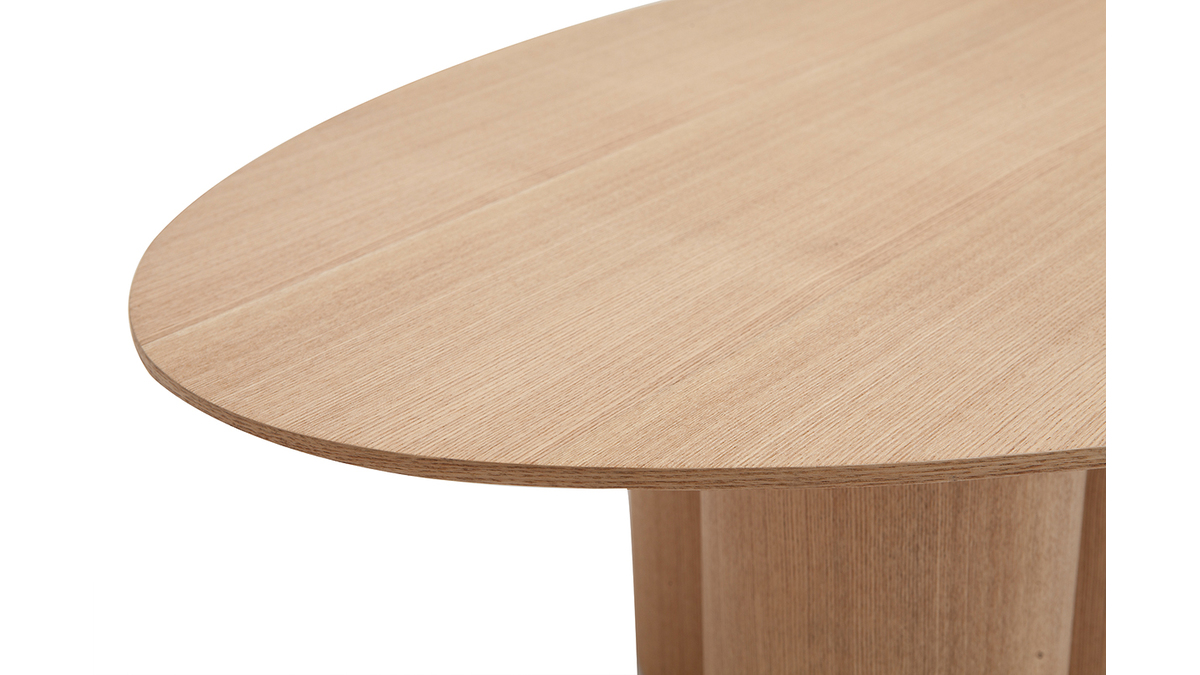 Sous des lignes fluides : fonctionnalité et robustesse vont de pair ! Élément central dans un séjour, formée par un piètement base trois cylindres et un large plateau ovale (L79 x L61 x E1.8 cm) en panneaux de fibres de bois placage frêne, cette table basse en bois clair rassemblera famille et amis le temps d'un apéritif festif, d'un goûter gourmand ou encore d'un plateau télé pour ne rien manquer de votre émission préférée !