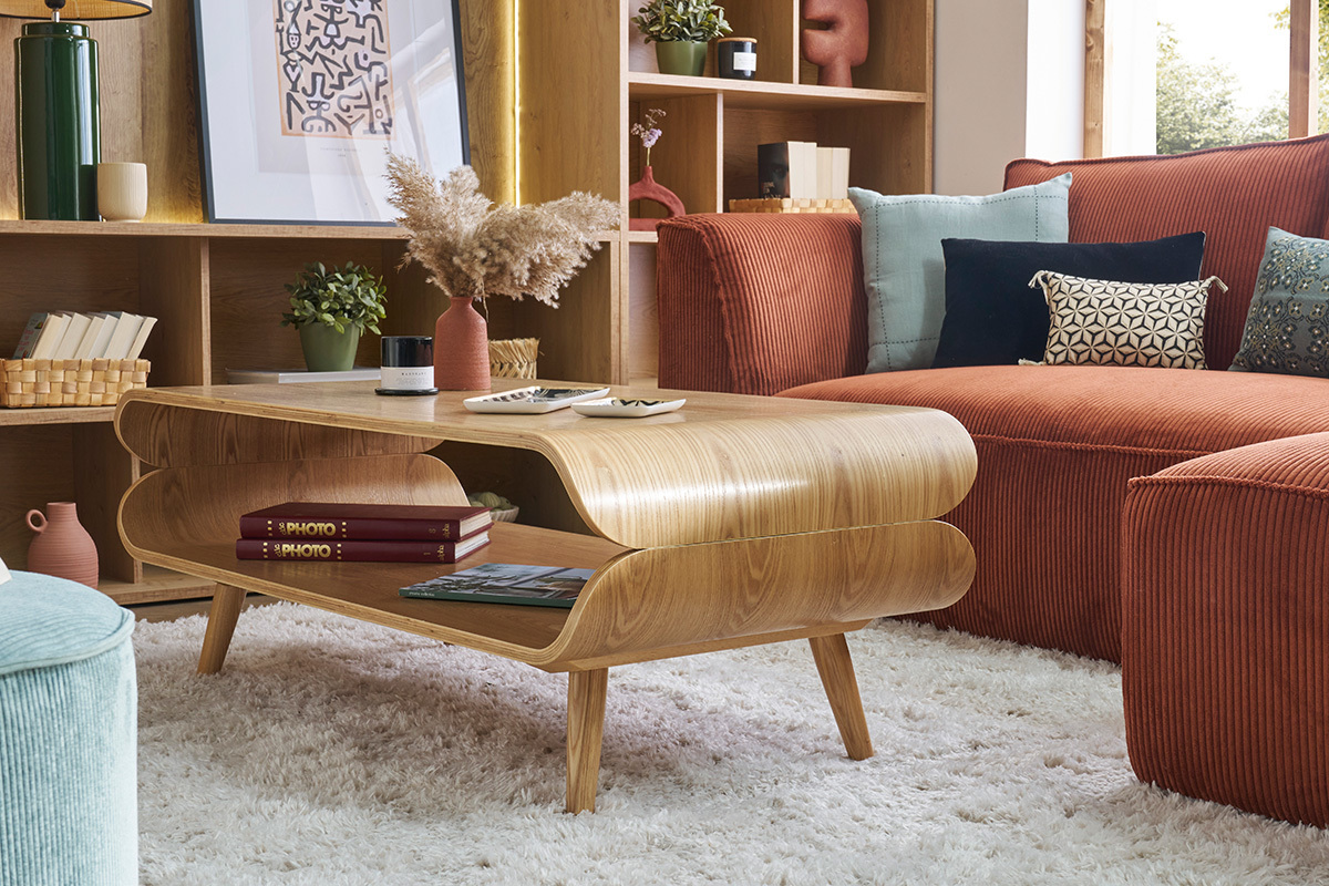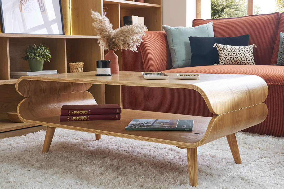 D'inspiration rétro, son design tout en rondeur et sa couleur bois clair dû à son placage frêne apporteront une touche d'authenticité à votre salon. Idéale pour donner du cachet à votre décoration d'intérieur, cette table basse en bois se révèle également être une pièce ultra pratique au quotidien. Elle bénéficie d'un espace de rangement astucieux : une grande niche pouvant accueillir des livres, des magazines ou de petits objets qui deviendront une décoration à part entière.
