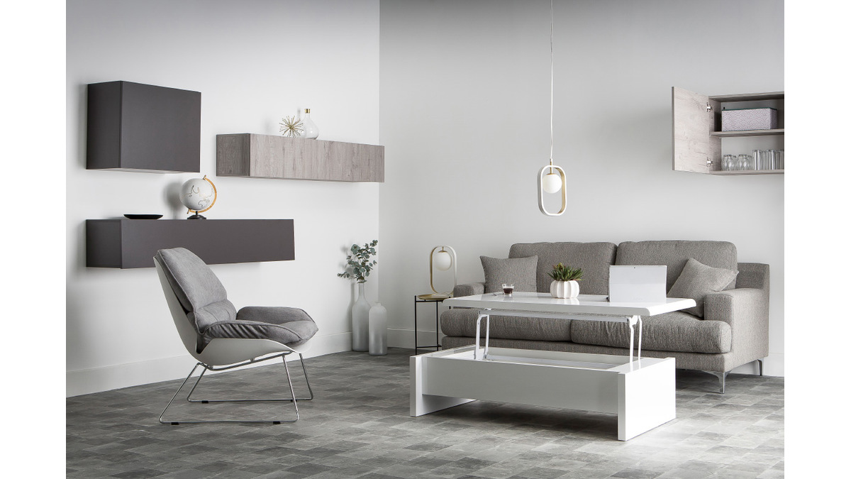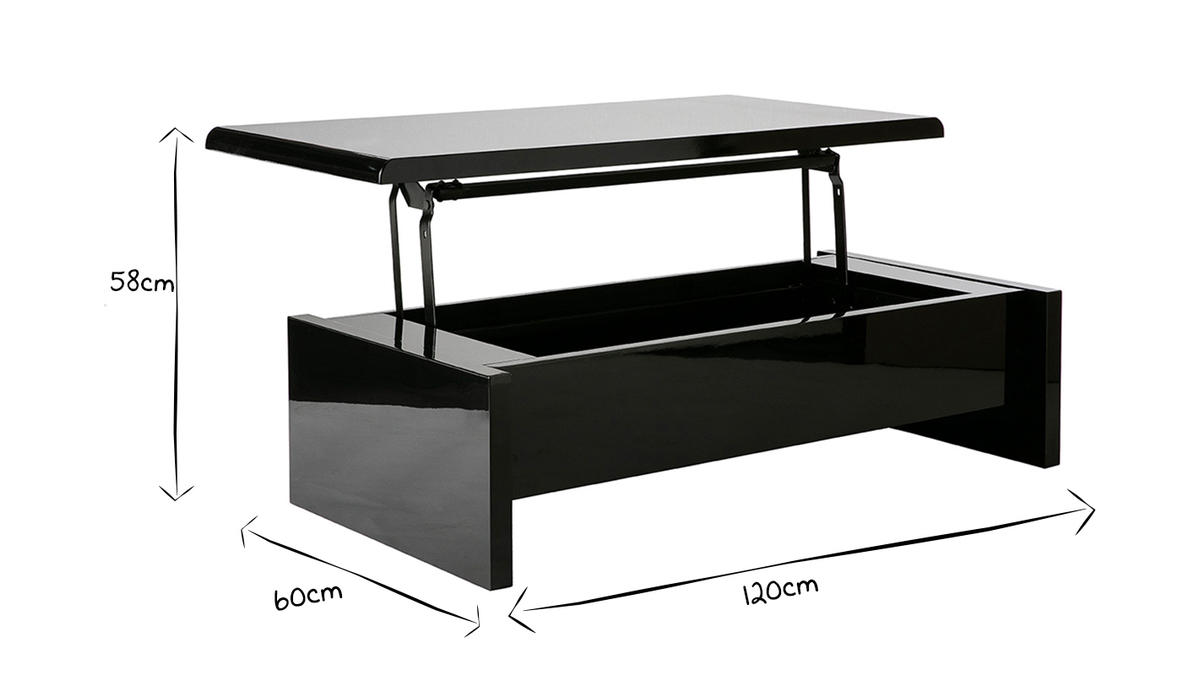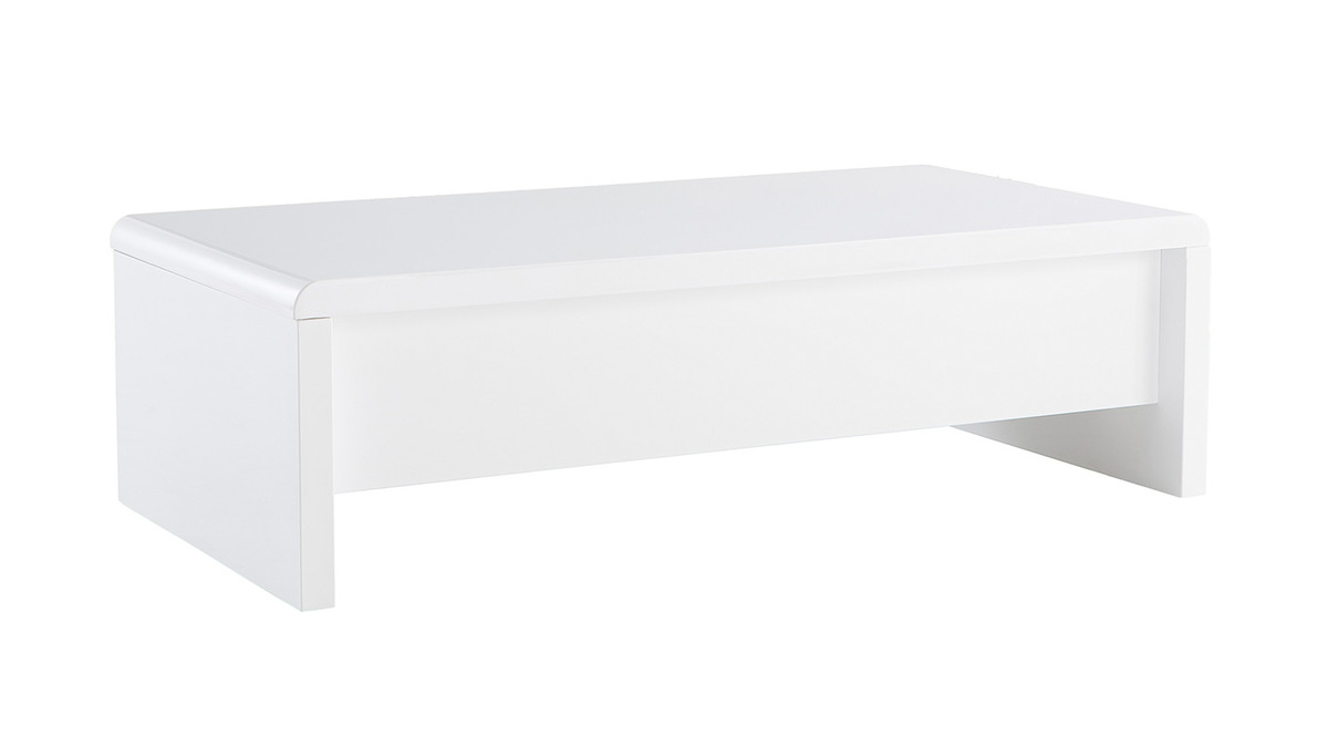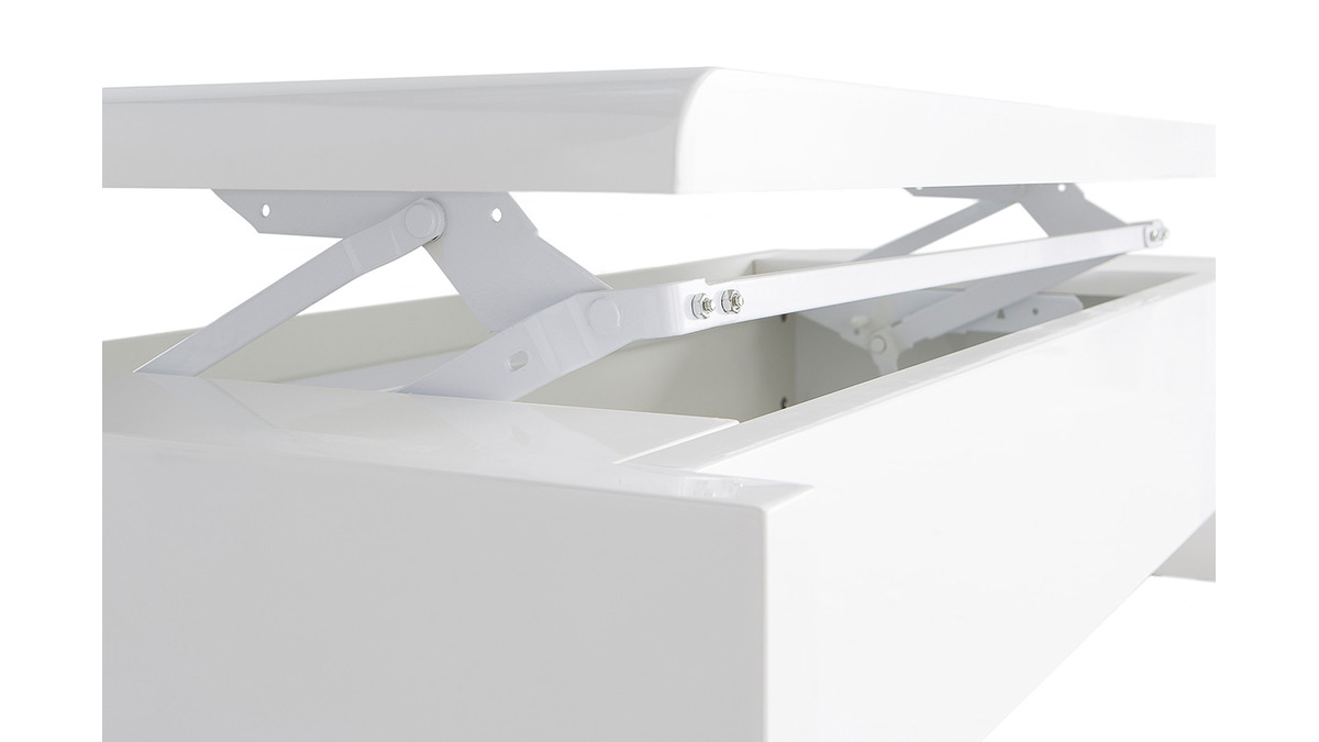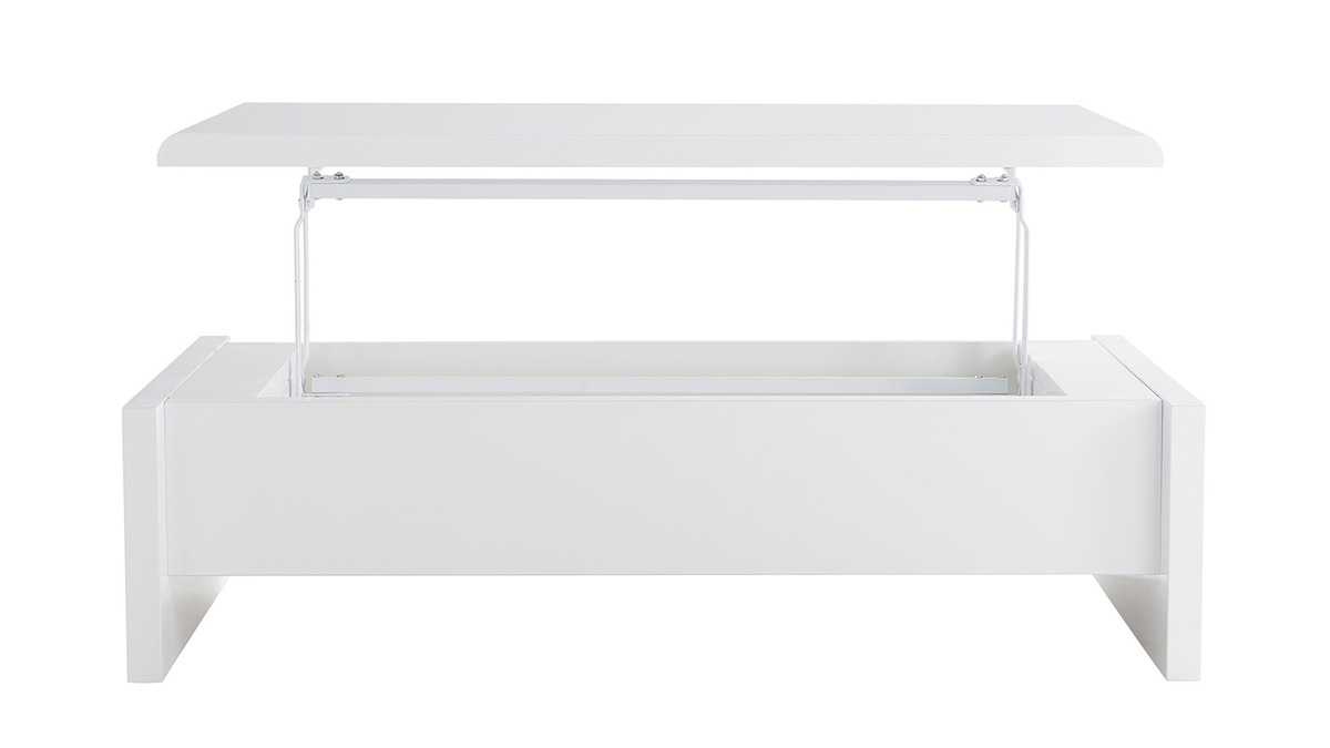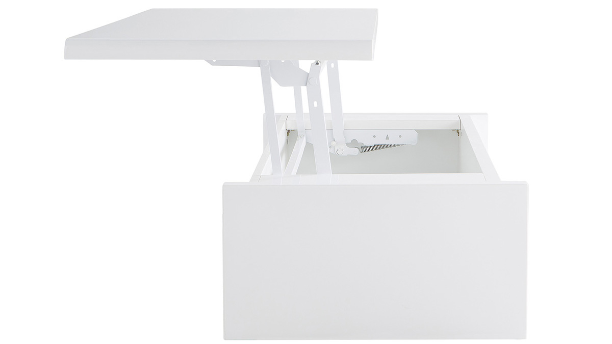 Cette table basse relevable est composée de panneaux de fibres de bois, avec une finition laquée.