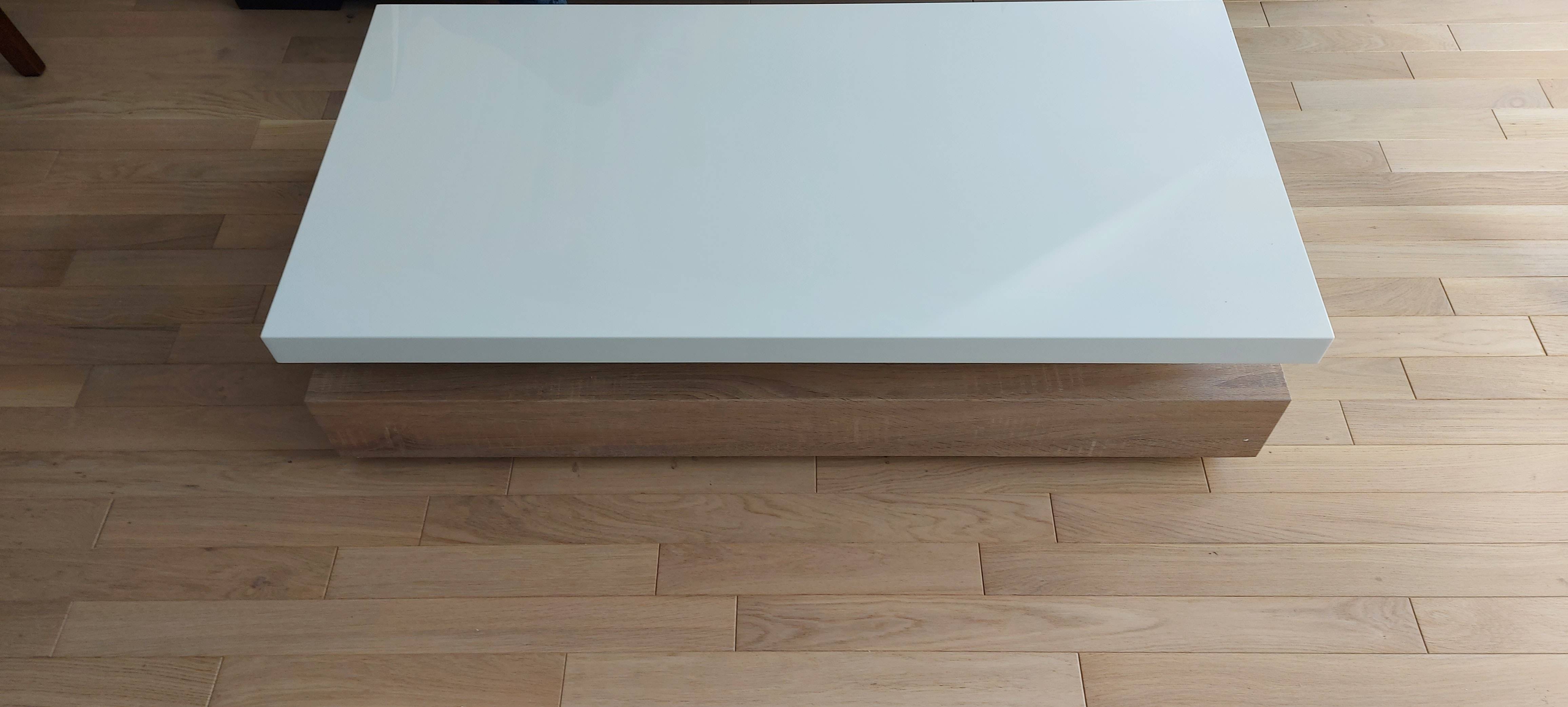 Matière : panneaux de fibres de bois finition laquée blanc brillant et bois clair