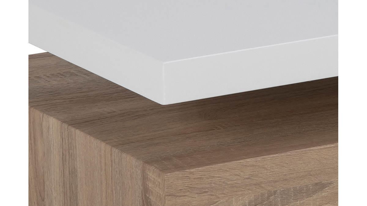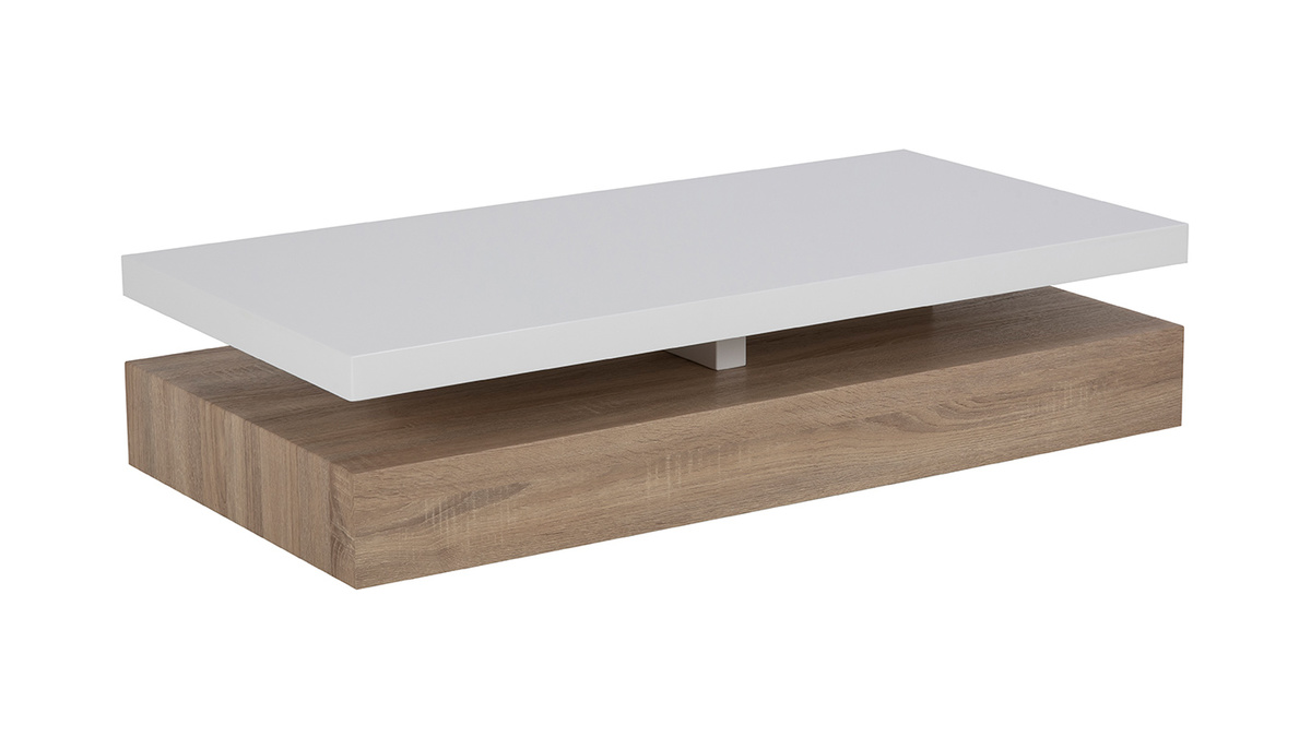 Avec son look contemporain et scandinave, elle suit les lignes de la tendance. Le mélange de finitions bois et laqué brillant, pile dans l'air du temps, en fait un objet moderne chaleureux, idéal pour réchauffer avec style le salon. Son piètement central, caractéristique des pièces de mobilier contemporaines, donne l'impression d'une table suspendue, un effet visuel qui apporte de la légèreté à ce meuble.