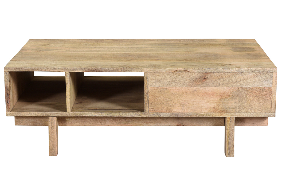 Pratique avec son grand plateau et ses différents rangements, il est possible de ranger les magazines qui traînent, les documents dans le tiroir et de ranger les télécommandes et manettes de jeu dans les deux niches ouvertes. Le plateau est ainsi laissé libre pour profiter d'instants conviviaux.