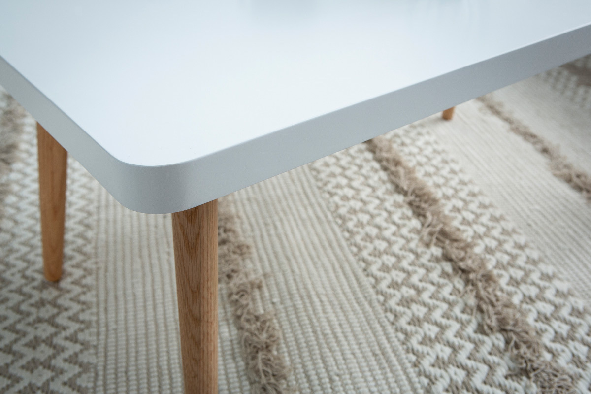 Cette table basse design est robuste grâce à sa structure en panneaux de fibres de bois et ses pieds en chêne. Elle apportera un style scandinave affirmé et conviendra à un salon aux teintes pastelles et naturelles.