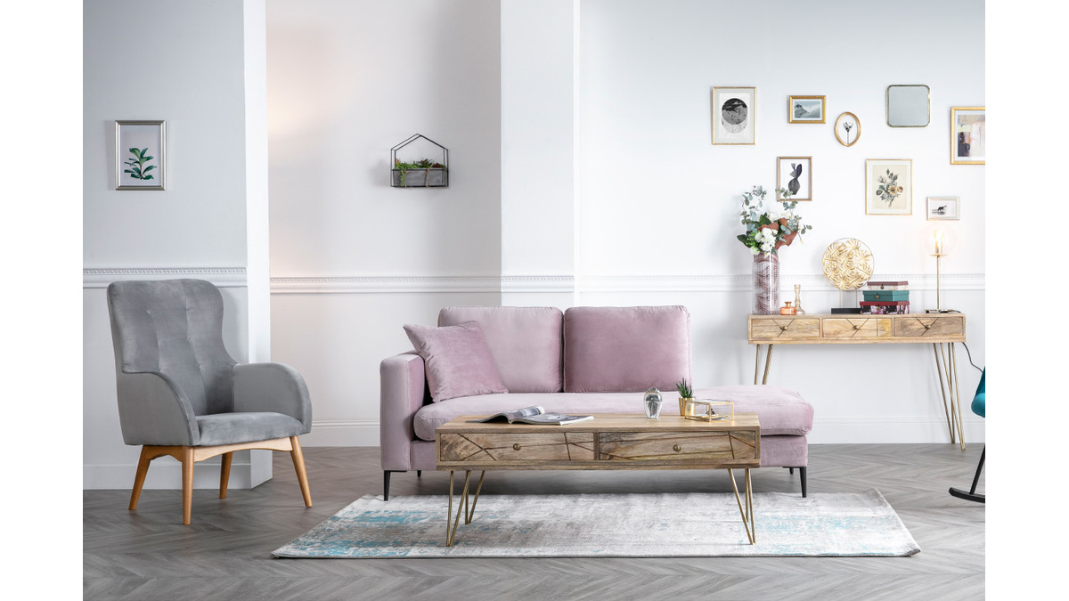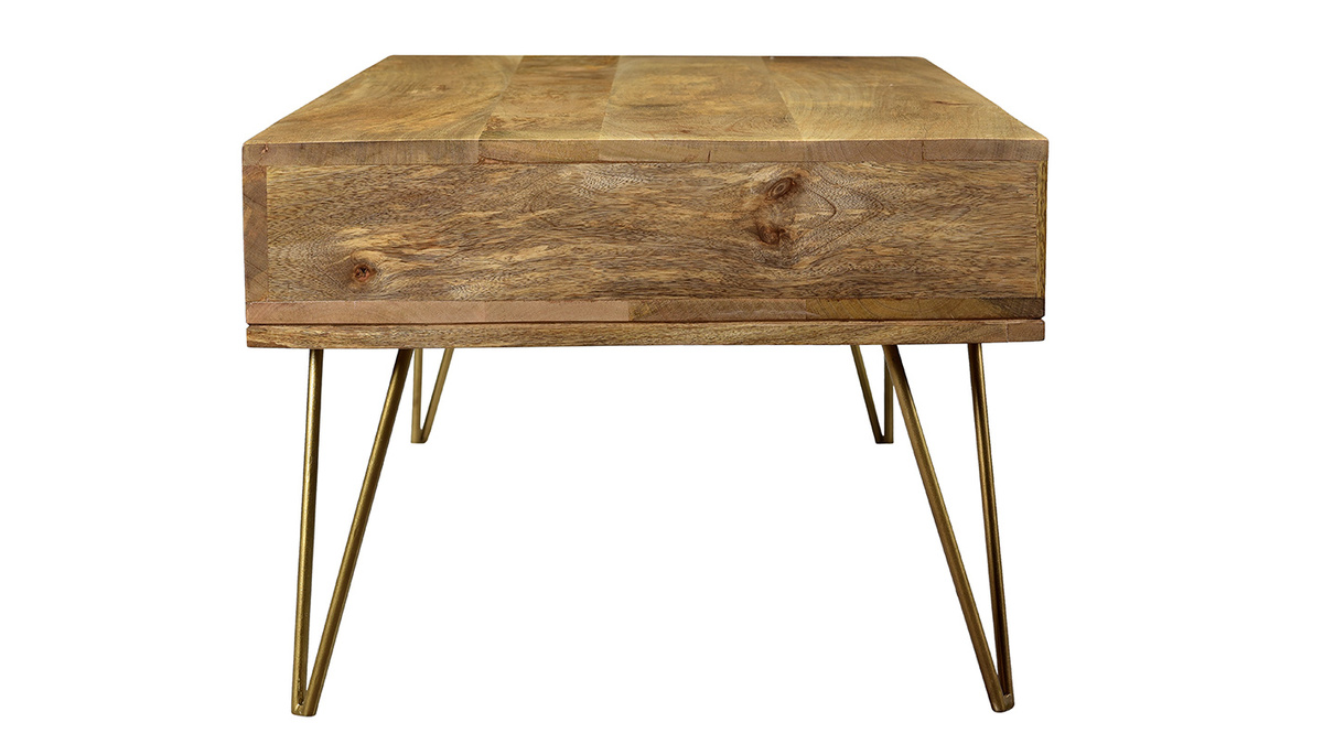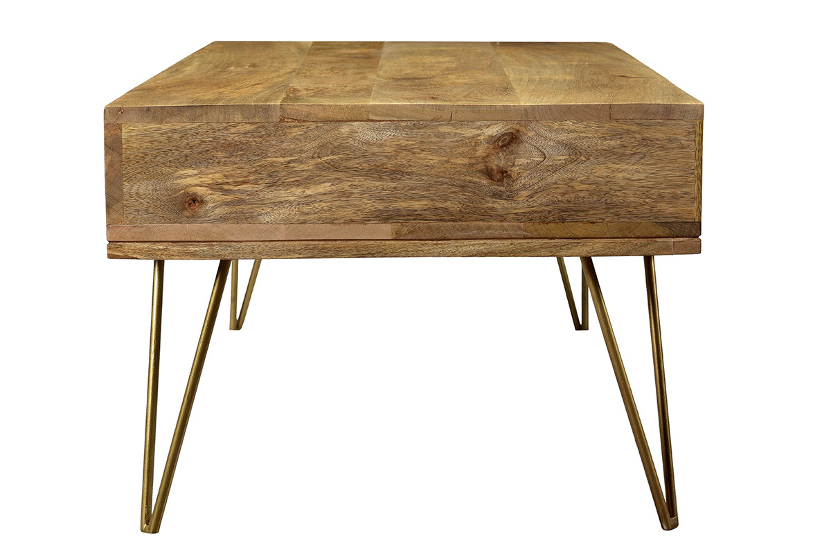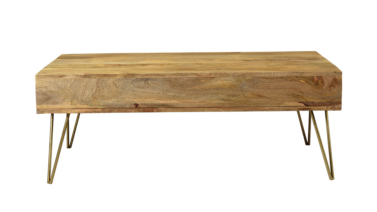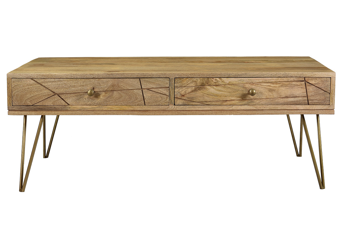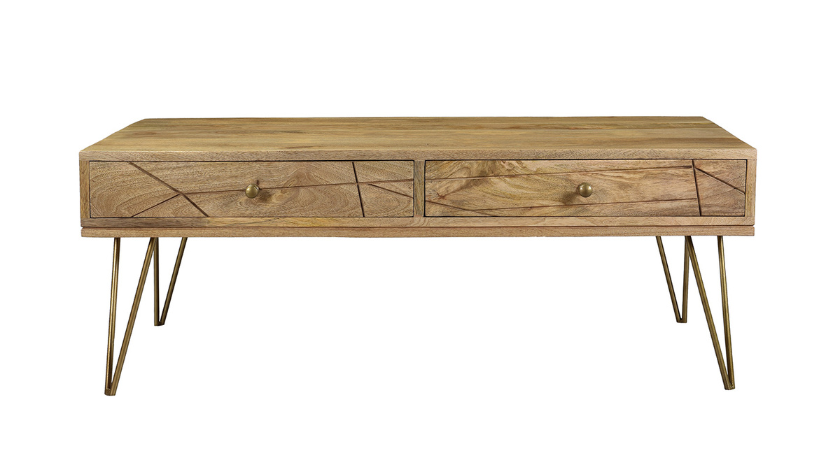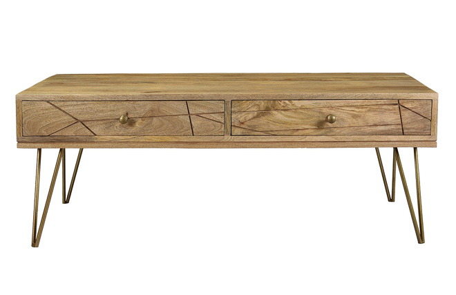 Avec son plateau en manguier, son motif géométrique gravé et ses éléments en métal doré, cette table basse est idéale pour un style authentique et chic. Le grain unique du manguier et les techniques artisanales utilisées pour créer le modèle LINIUM donnent à l'ensemble un aspect brut qui ne manque pas de charme. Pour moderniser le tout, un piètement fin en épingle a été ajouté. Il permet d'apporter légèreté et brillance à ce meuble en bois massif.