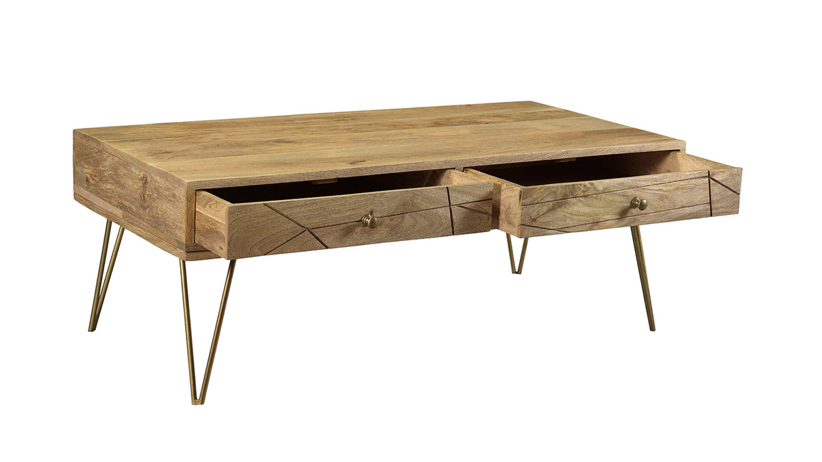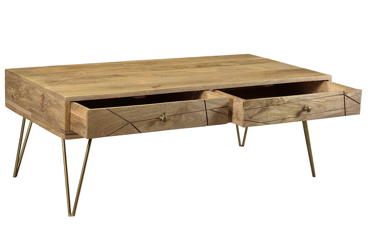Pour faire du salon un espace convivial et organisé, cette table basse rectangulaire est équipée de deux tiroirs de rangement et d'un grand plateau. Le manguier est un bois tropical résistant permettant de profiter de sa table LINIUM au quotidien.