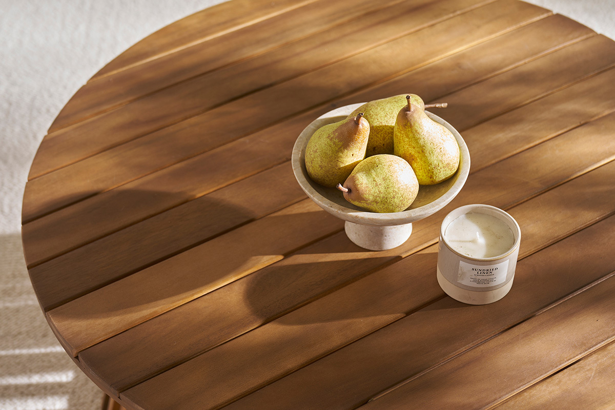 Au fil du temps, le produit de traitement appliqué sur l'acacia risque de se détériorer. Afin d'appliquer un nouveau traitement vous devez procéder comme suit : poncez légèrement l'ancien traitement puis dépoussiérez-le bien à la fin de l'opération. Appliquez ensuite votre nouveau traitement. Dans tous les cas, faites un essai sur une partie non visible du mobilier. Surtout ne passez aucun produit de traitement directement sur l'article, ceci sans avoir retiré par ponçage son traitement protecteur d'origine.