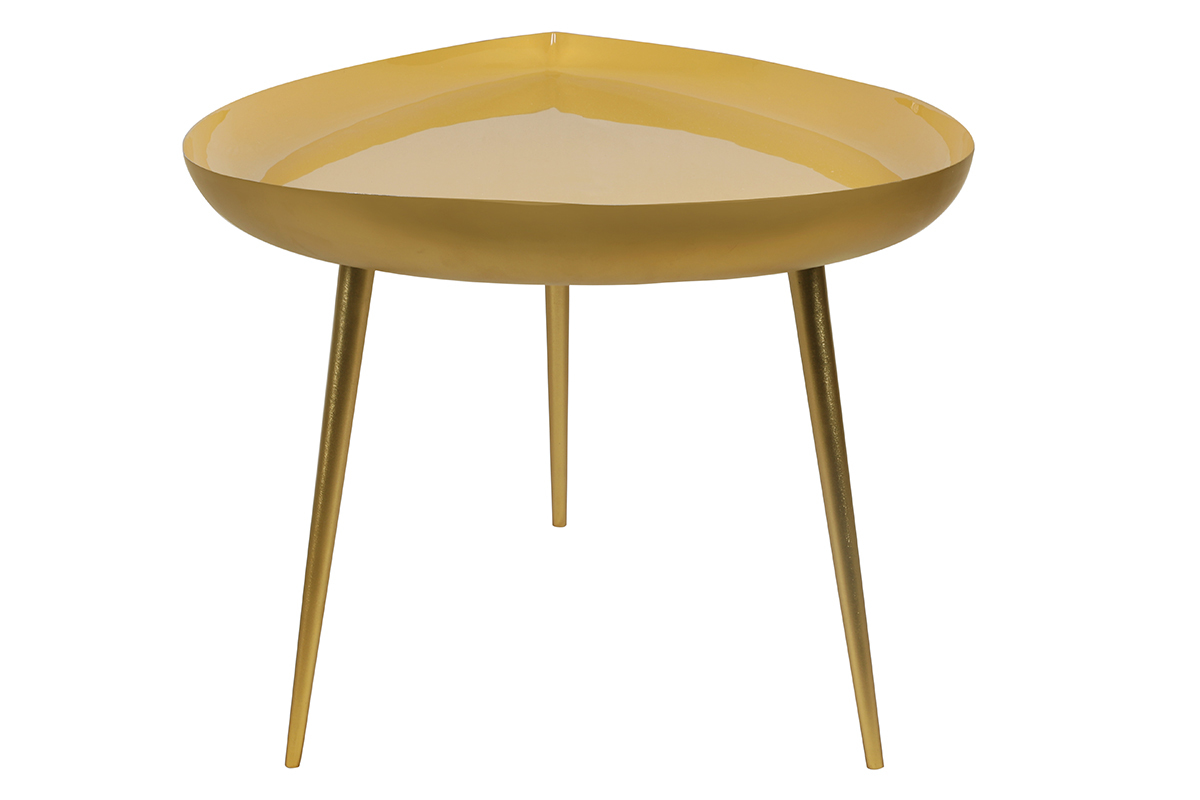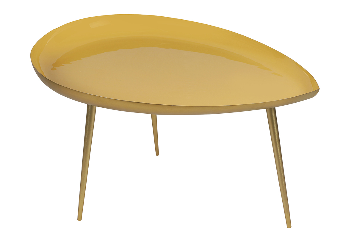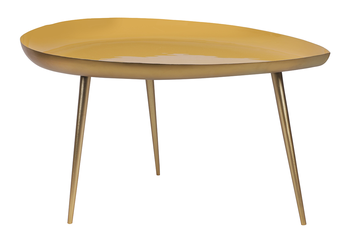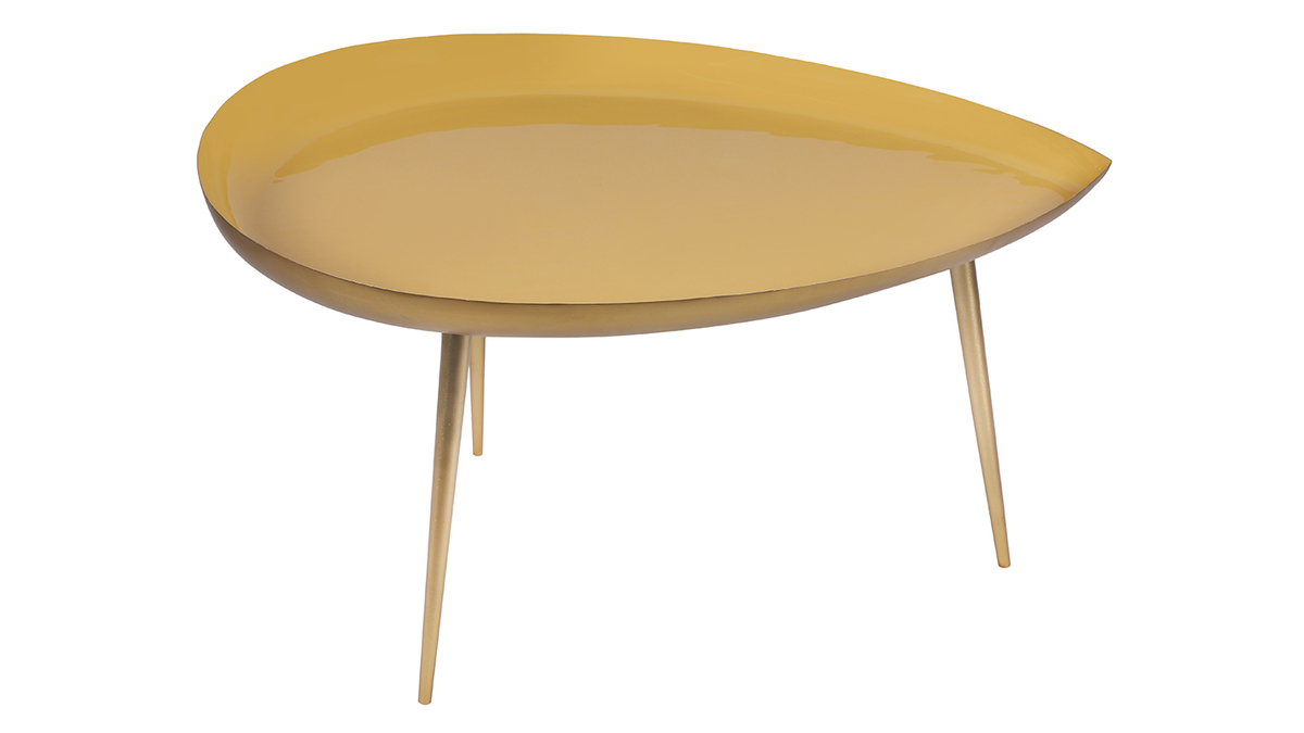 Sa ligne étonnante en forme de goutte nous transporte vers une destination qui nous était encore inconnue. On y découvre un magnique travail artisanal, un jeu de matières unique et un mélange de couleurs flamboyant. La table basse moderne DROP est comme un petit trésor, c'est la pièce précieuse du salon. Avec la finition laquée de son plateau et la peinture dorée de sa structure en acier, elle brille de mille éclats. Cette table goutte au charme fou donnera un vrai esprit authentique à l'espace autour du canapé. Dépaysement garanti !