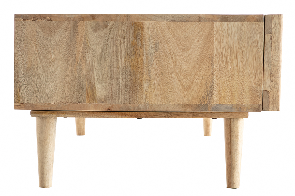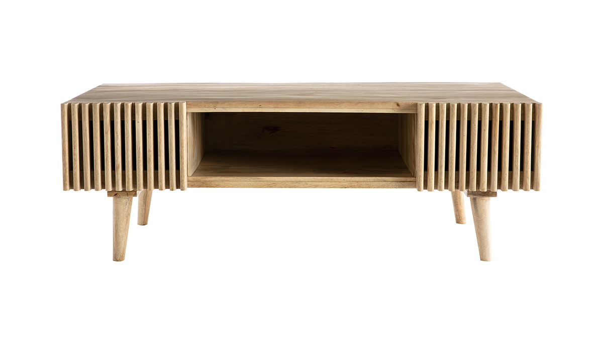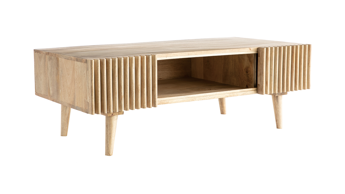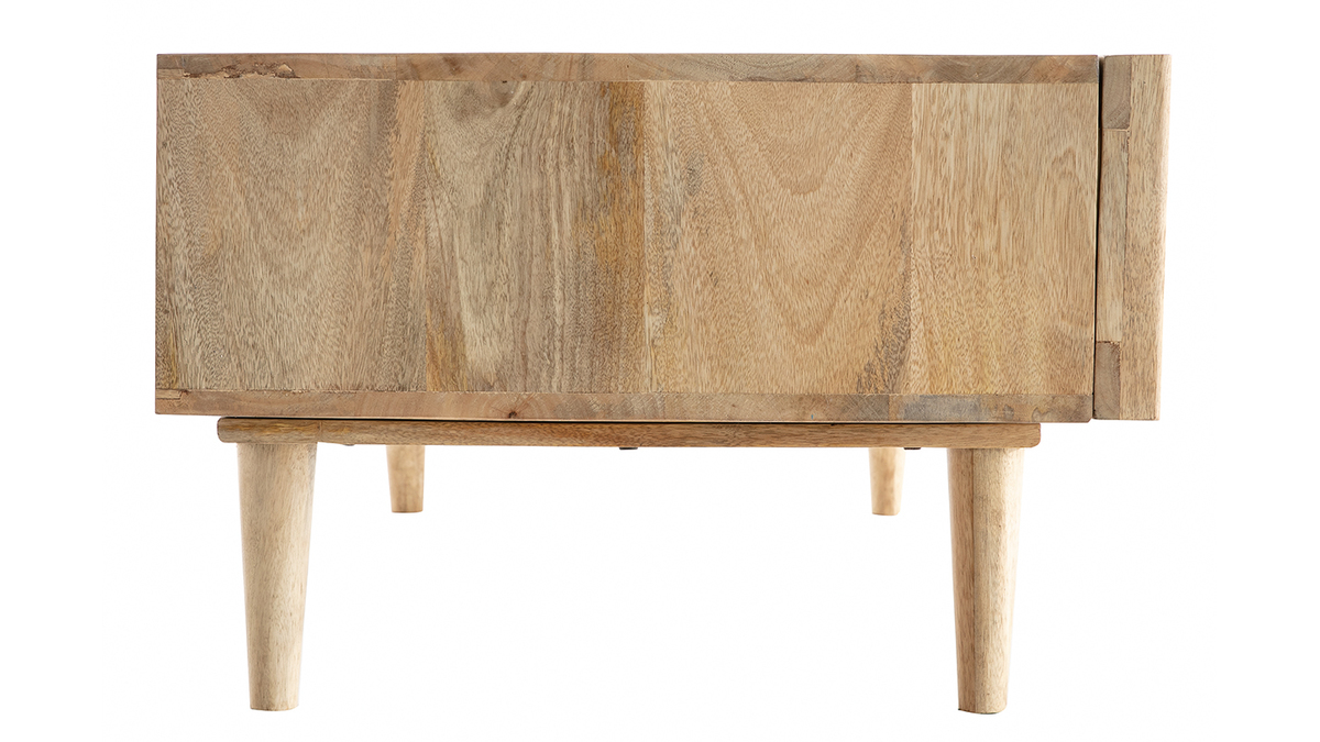 Du bois massif, une forme minimaliste qui rappelle le style scandinave, une touche de fantaisie subtile... cette table basse rectangulaire possède toutes les qualités des meubles dans l'esprit scandicraft. Conçue en manguier, un bois aux tons chauds et aux stries caractéristiques, elle offre un rendu chaleureux. Son piètement haut et ses portes coulissantes ajourées lui donnent un style léger et original.