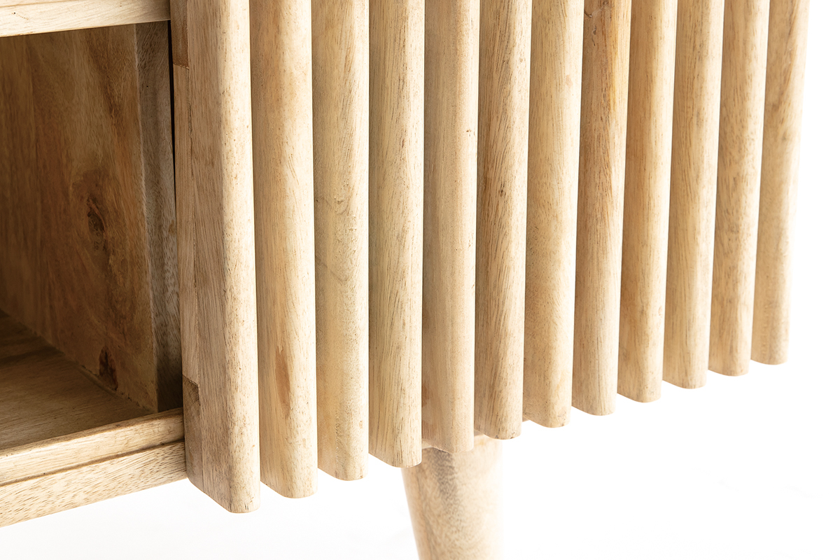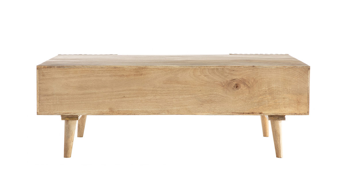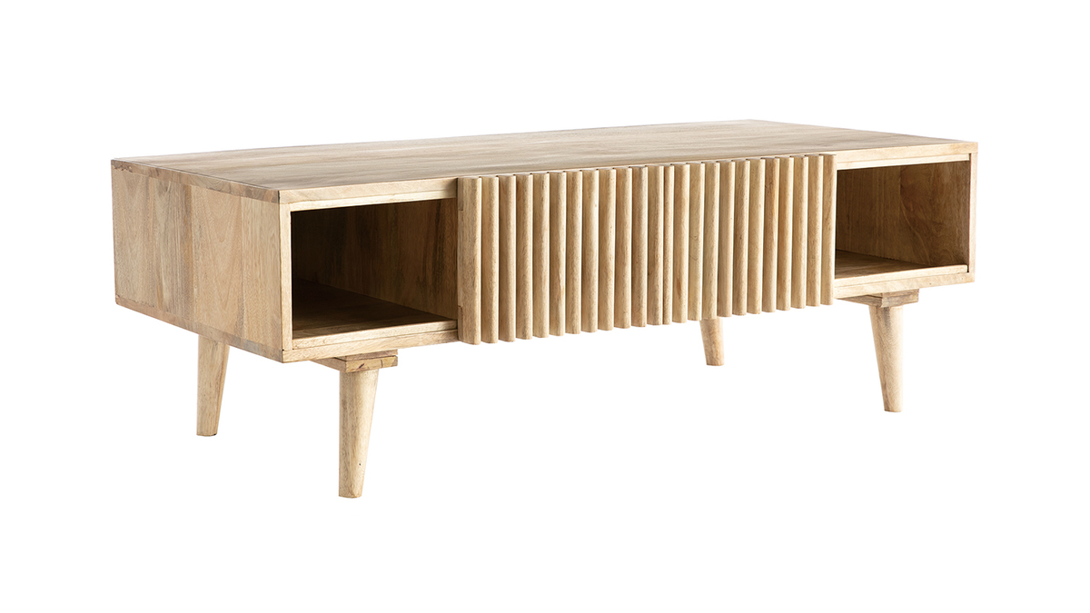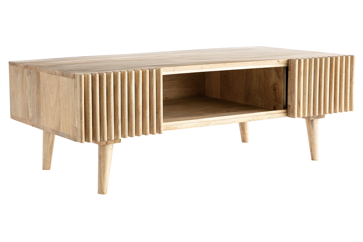 Du bois massif, une forme minimaliste qui rappelle le style scandinave, une touche de fantaisie subtile... cette table basse rectangulaire possède toutes les qualités des meubles dans l'esprit scandicraft. Conçue en manguier, un bois aux tons chauds et aux stries caractéristiques, elle offre un rendu chaleureux. Son piètement haut et ses portes coulissantes ajourées lui donnent un style léger et original.