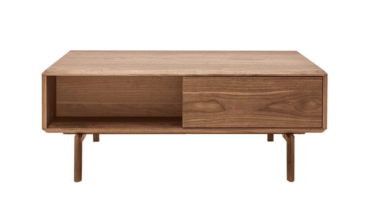 Composée d'une niche ouverte, elle dispose également de deux tiroirs très pratiques. Aussi astucieuse que stylée, cette table basse couleur noyer affiche un sans faute.