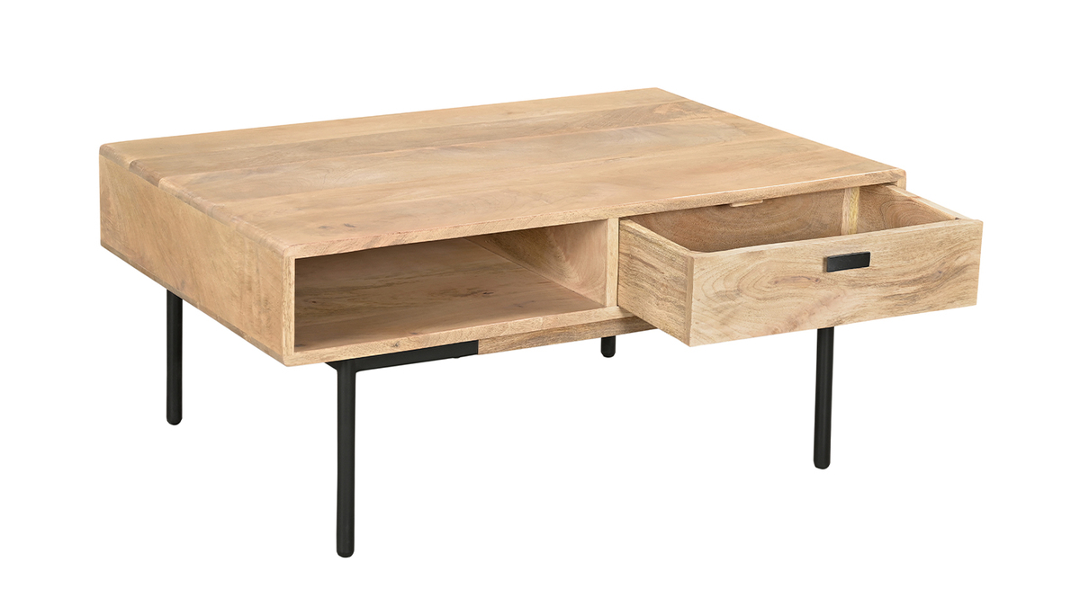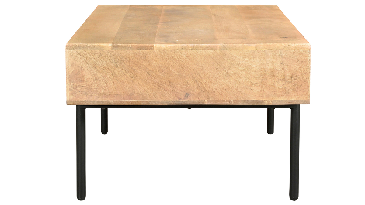 Contraste et esprit chaleureux. Si le mariage du bois massif - essence de bois tropical lumineuse - et du métal noir séduira à coup sûr les amateurs du style industriel, cette table basse carrée met à l'honneur un savoir-faire artisanal qui saura se fondre dans de nombreux intérieurs en quête de caractère.