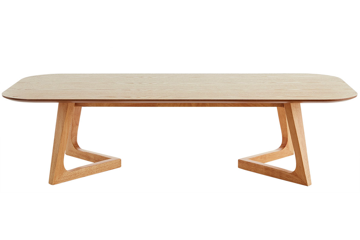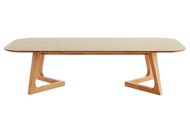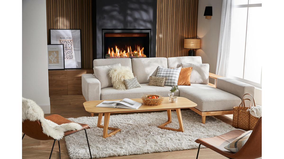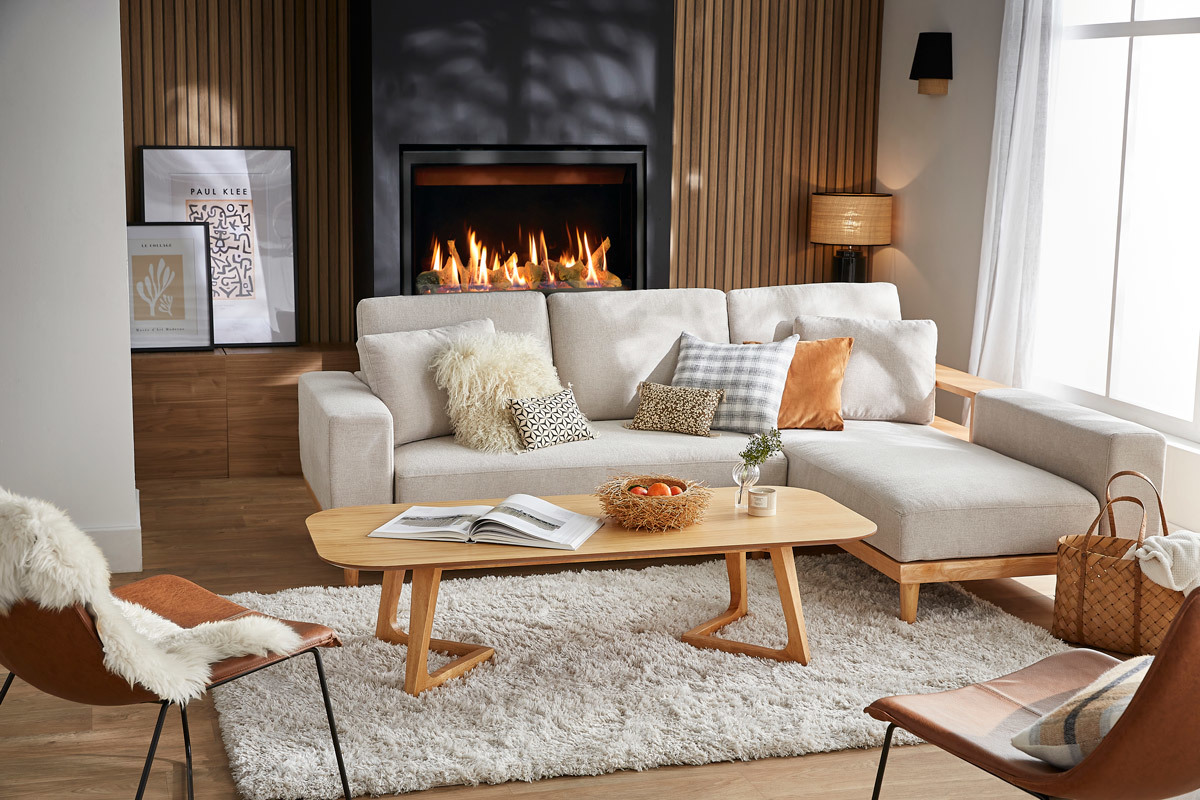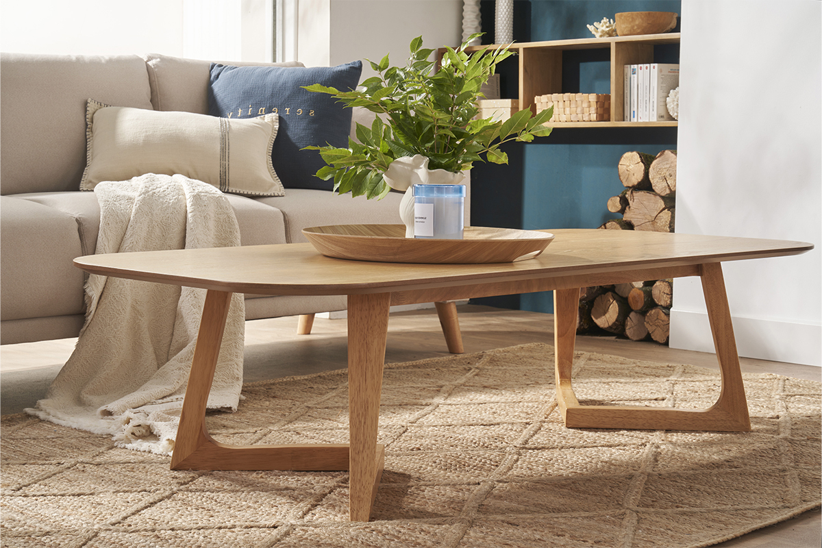Pour un intérieur aussi cosy que trendy, on accompagne cette grande table basse en bois d'un canapé épuré, d'un pouf effet laine bouclée, et d'un fauteuil design branché !