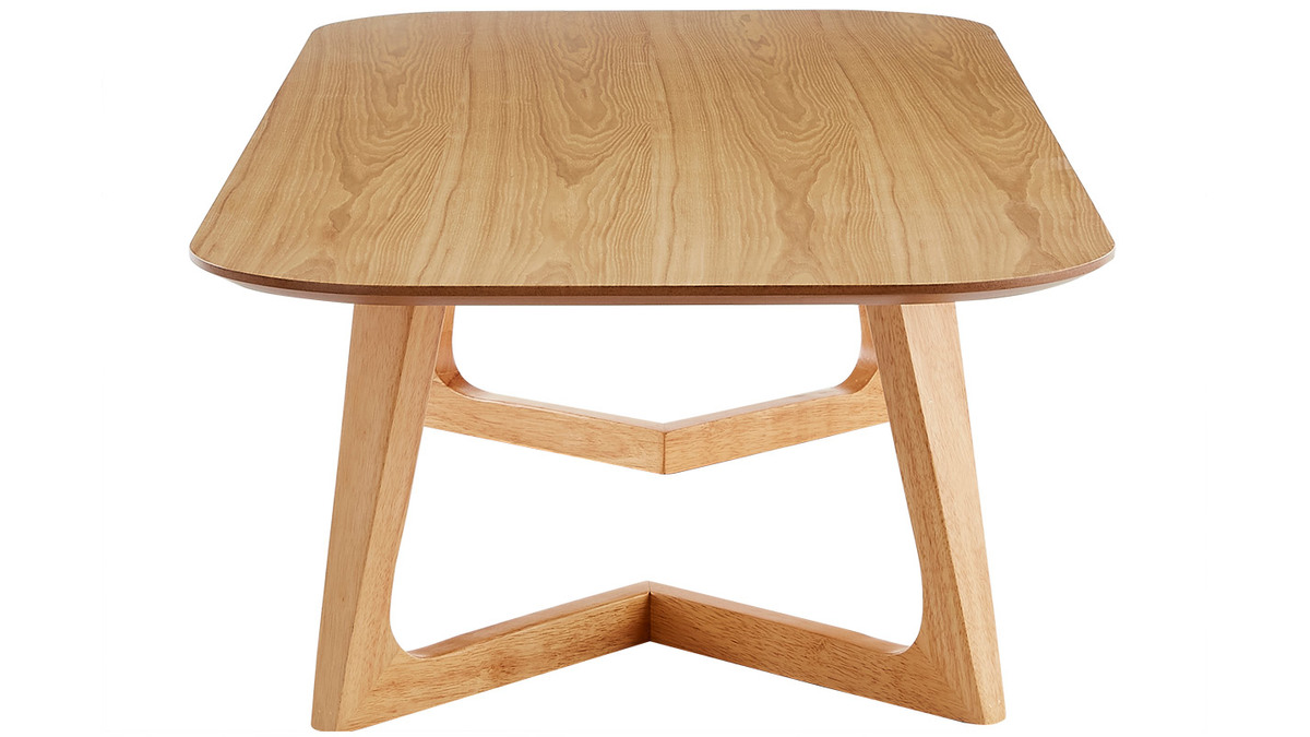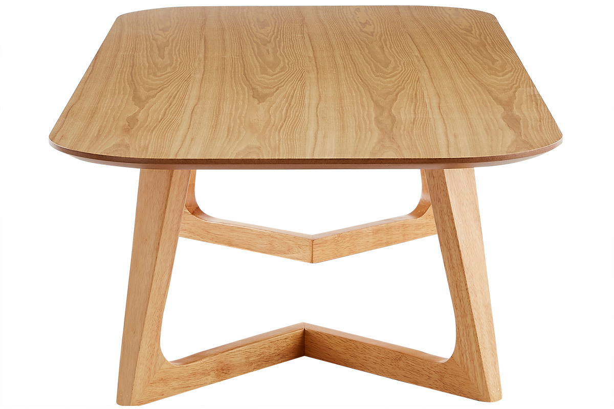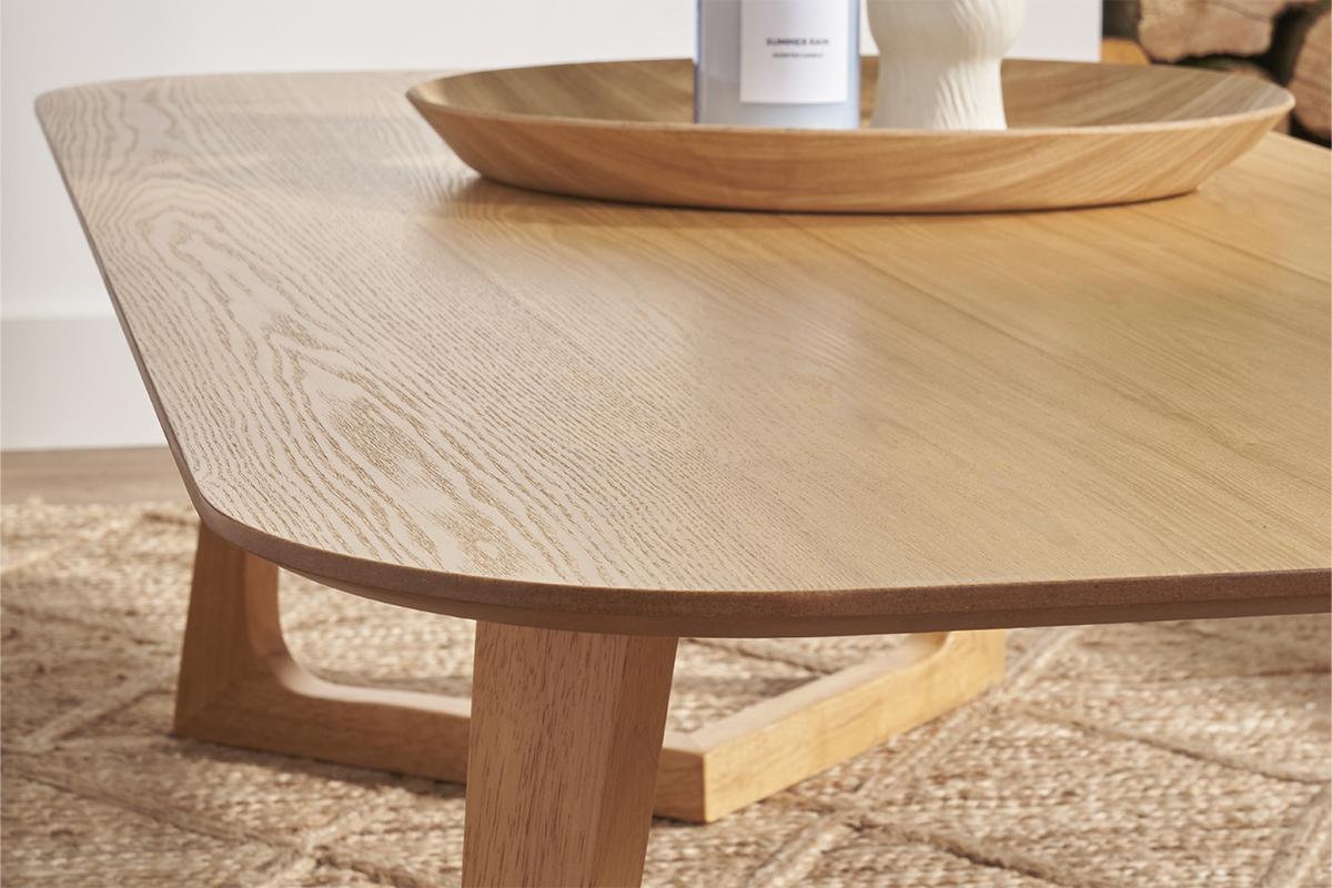D'apparence simple, la table basse JUKE dévoile un piétement unique très graphique. Si son plateau nervuré en panneaux de fibres de bois placage frêne nous laisse penser que JUKE est une table basse scandinave classique, ce piétement joliment taillé nous prouve le contraire ! À la forme unique, les pieds en hévéa massif donnent un vrai twist à l'ensemble et signent la silhouette singulière de cette table basse rectangulaire.